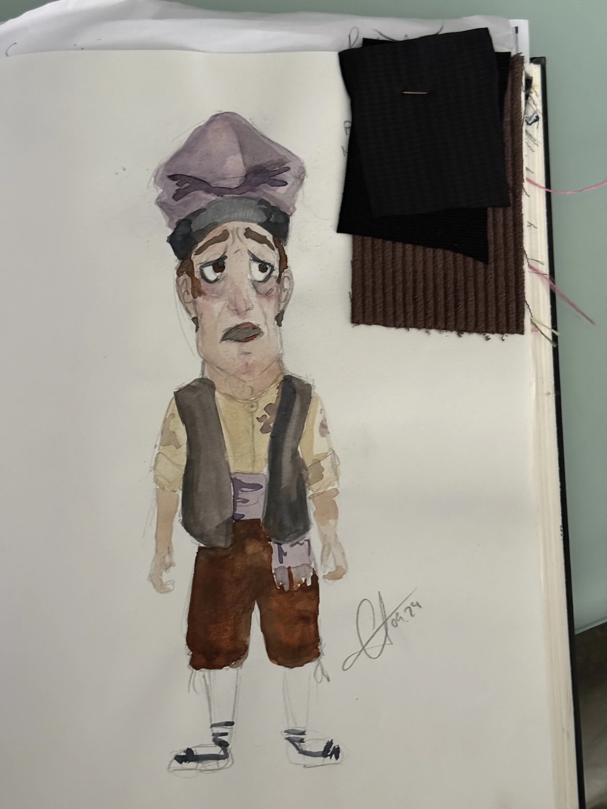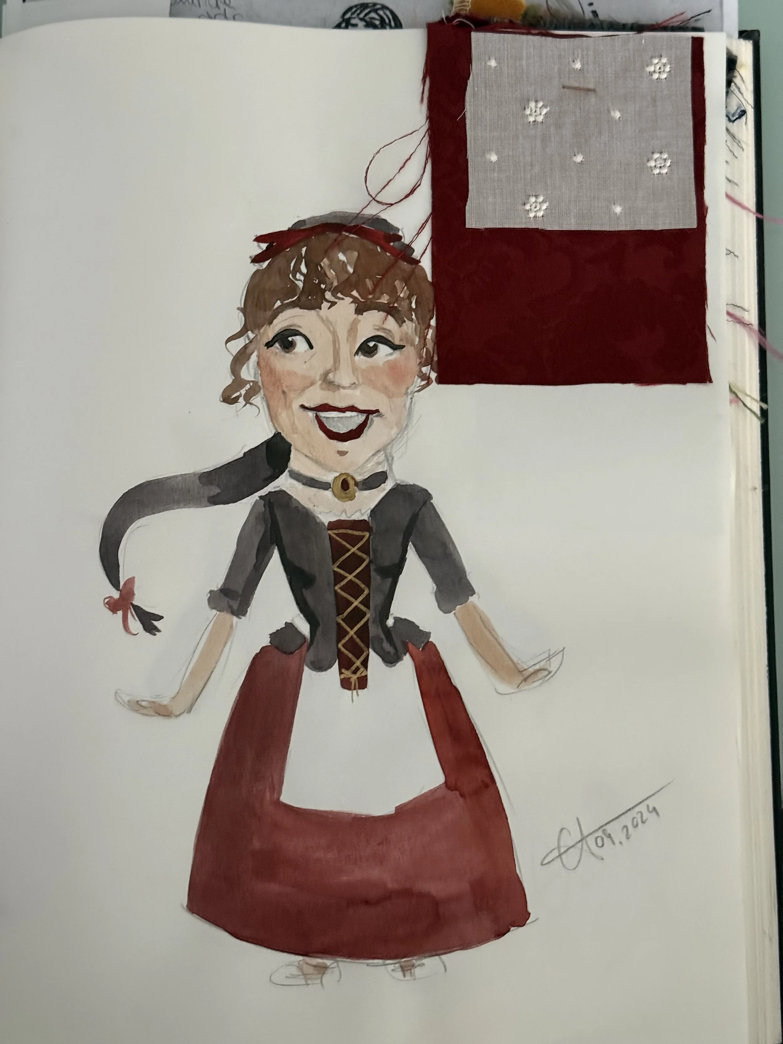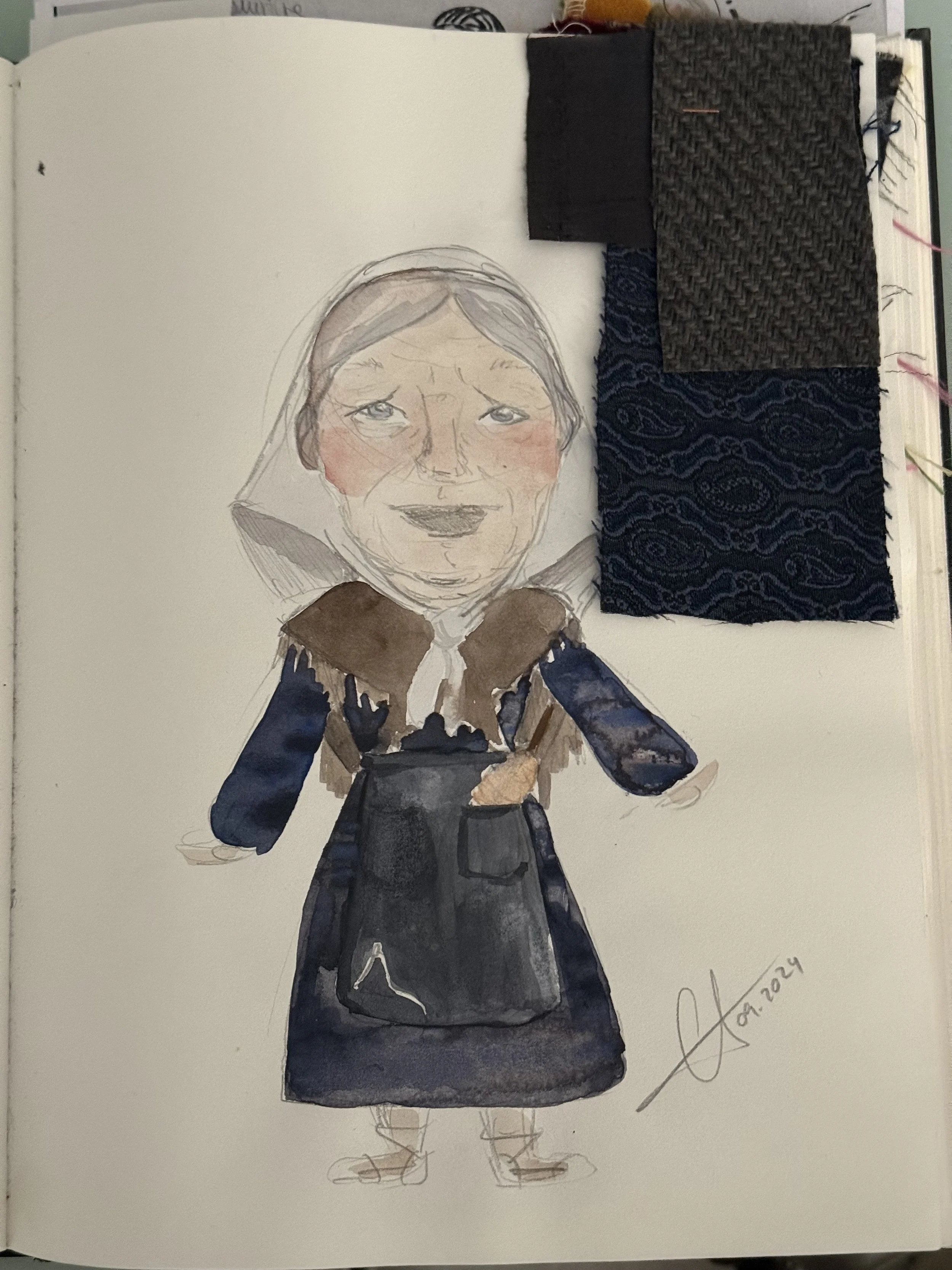Per complementar-los, s’ha seguit amb una paleta de colors adient per cada personatge amb el vestuari confeccionat per l’ Imma Navarro. El vermell per la pubilla, el blau per l’àvia, el groc i terrenosos pel clèrgue i el morat pel pagès.
