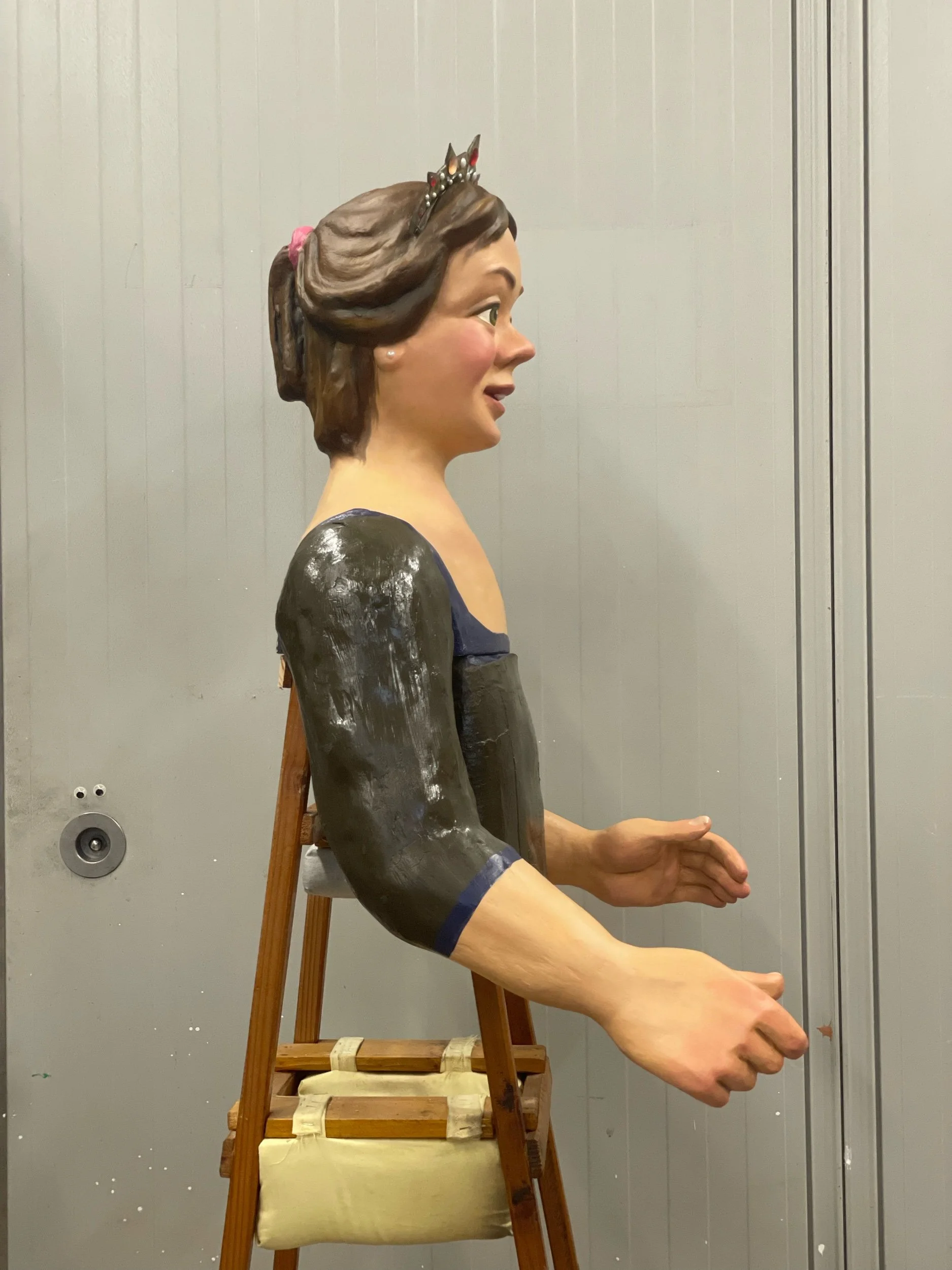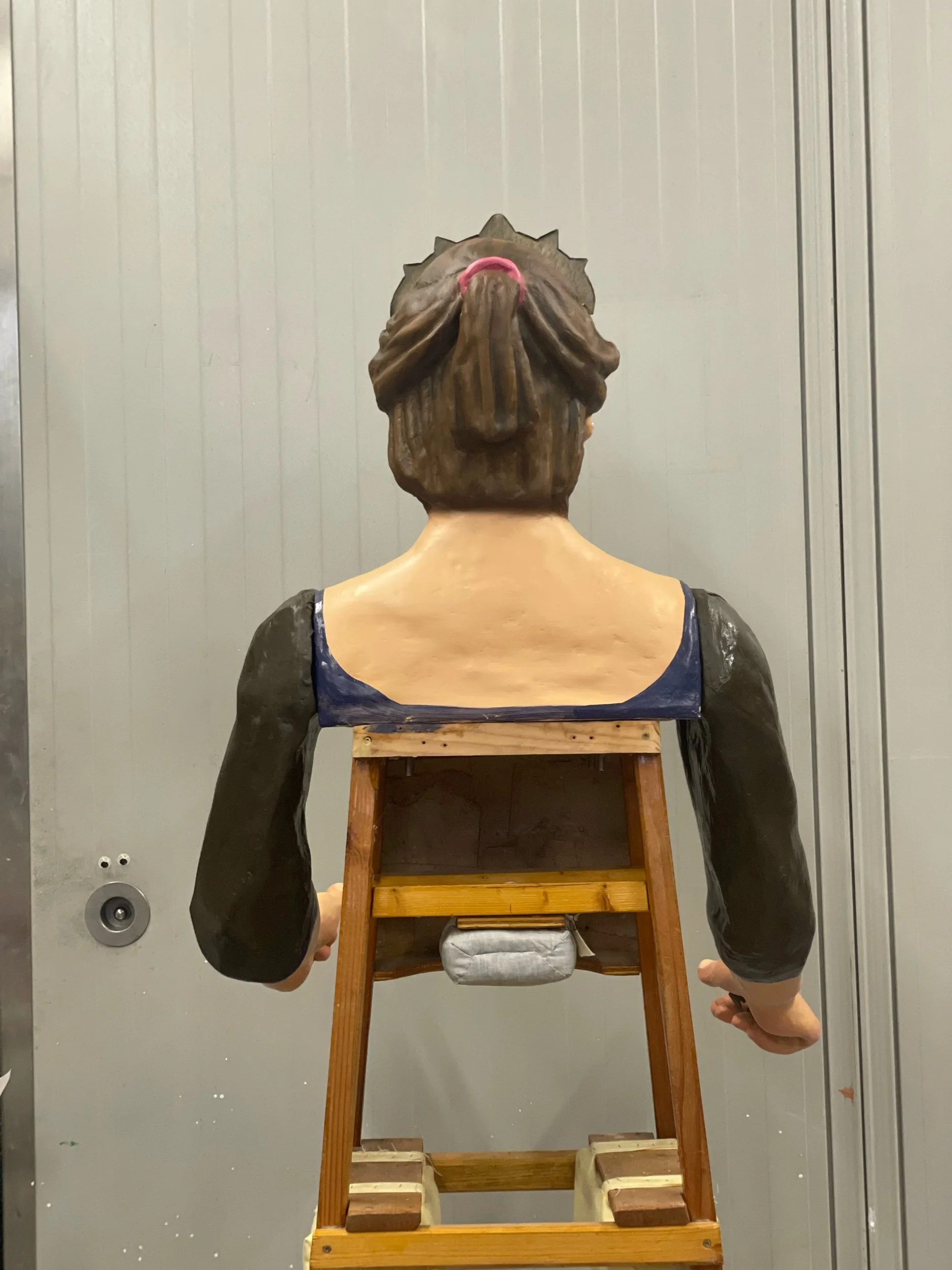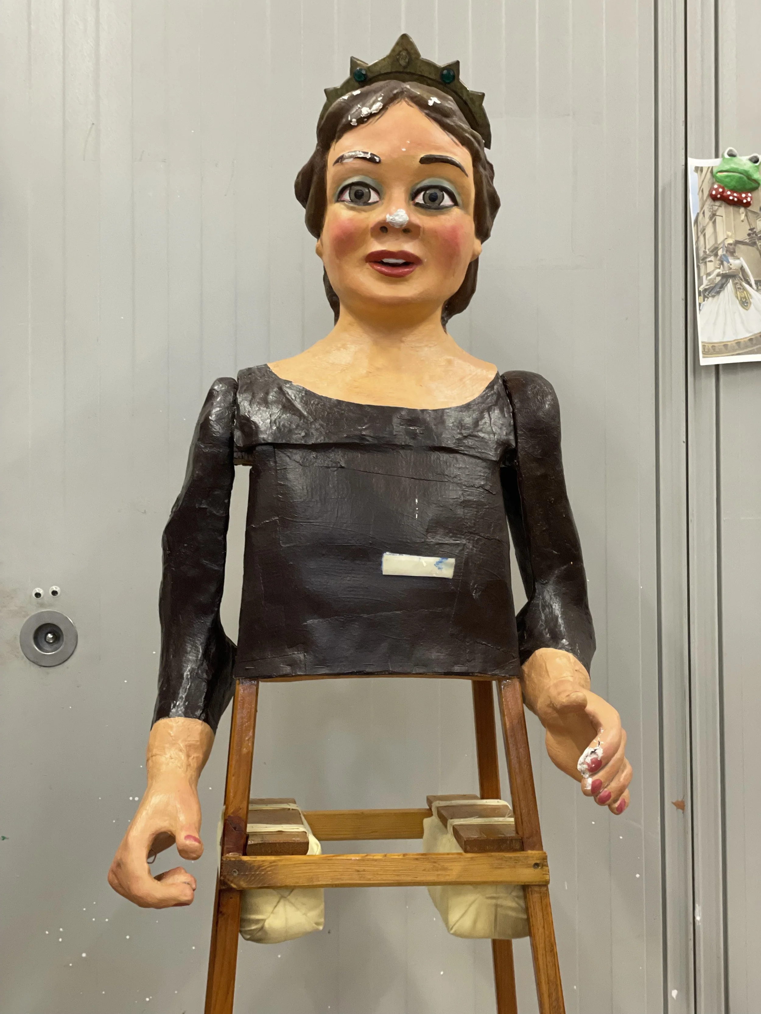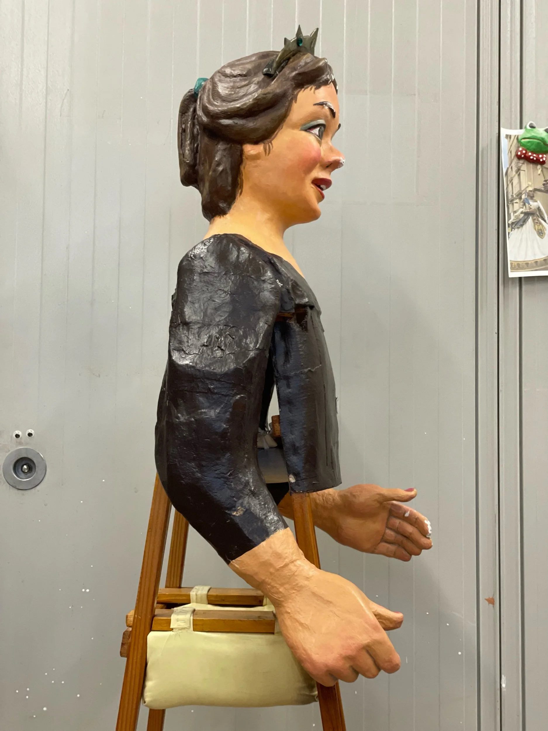 La gegantona Gal·la va venir al taller després d’una desafortunada caiguda. Aprofitant l’ocasió es va optar per anivellar les espatlles, refer part dels braços i fer que el bust fós desmuntable per facilitar-ne el seu trasllat.