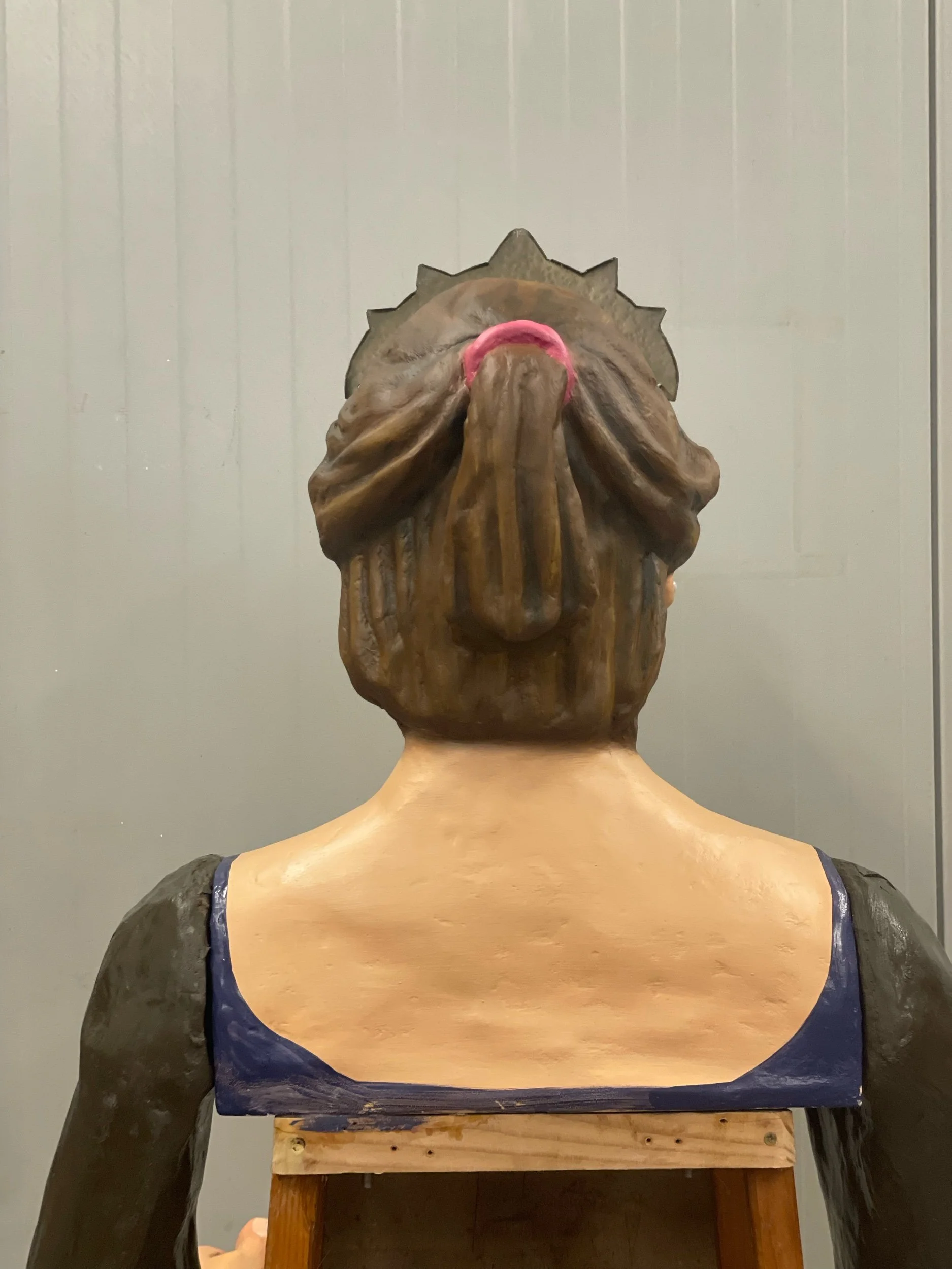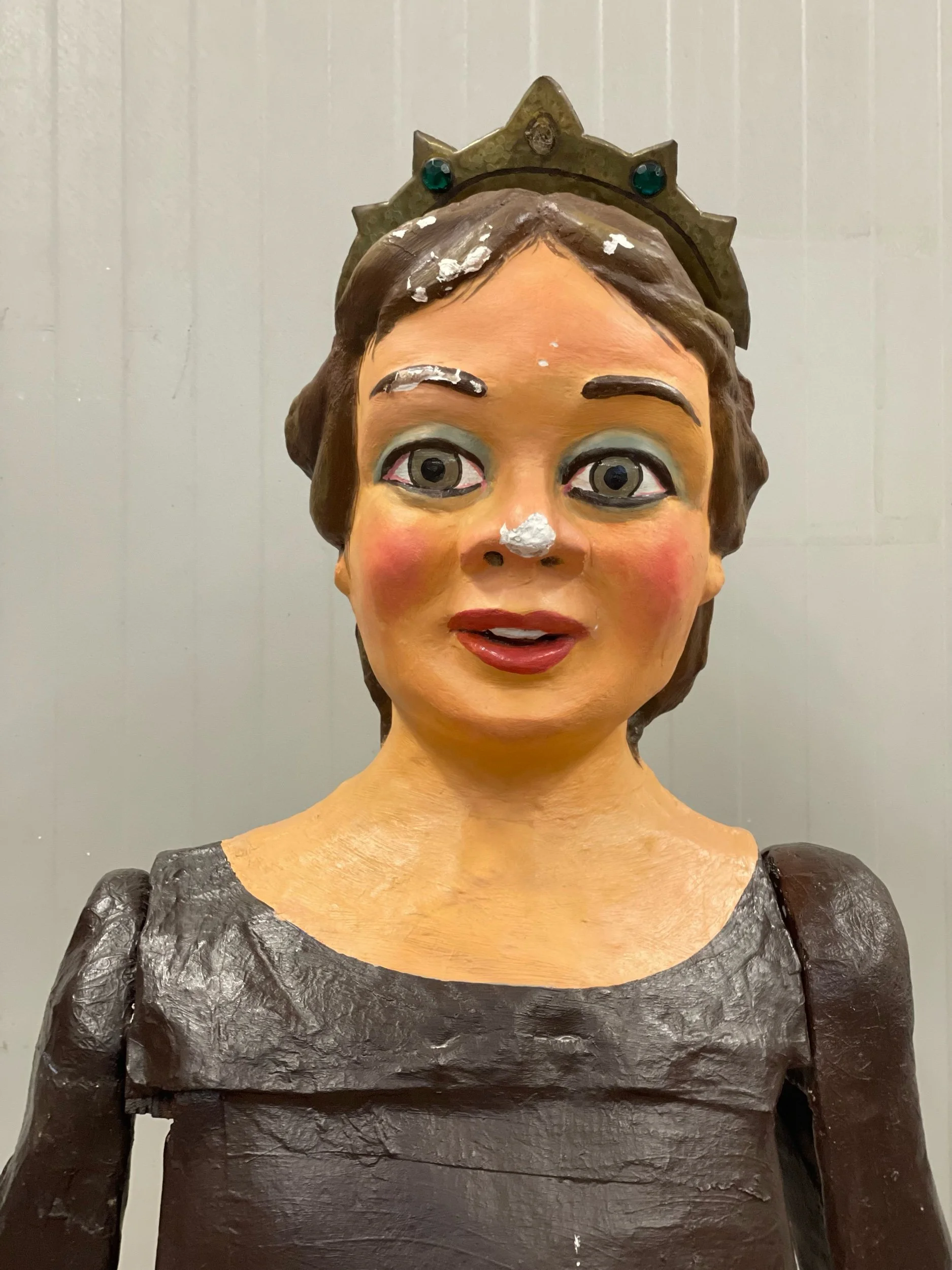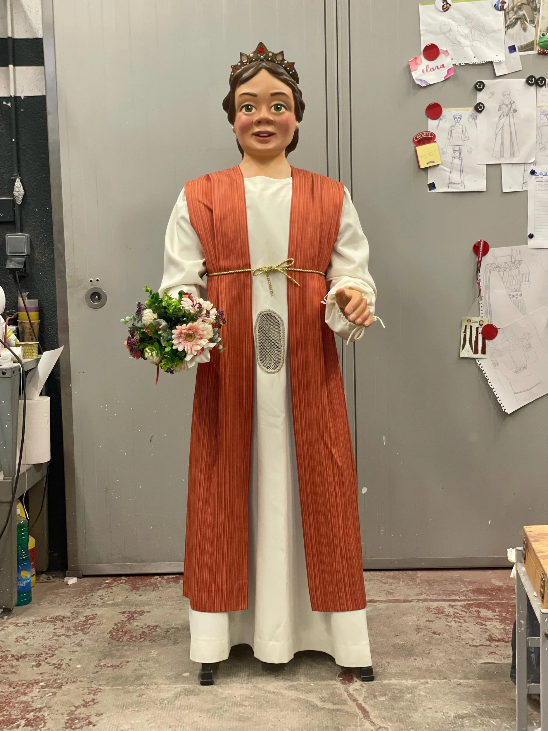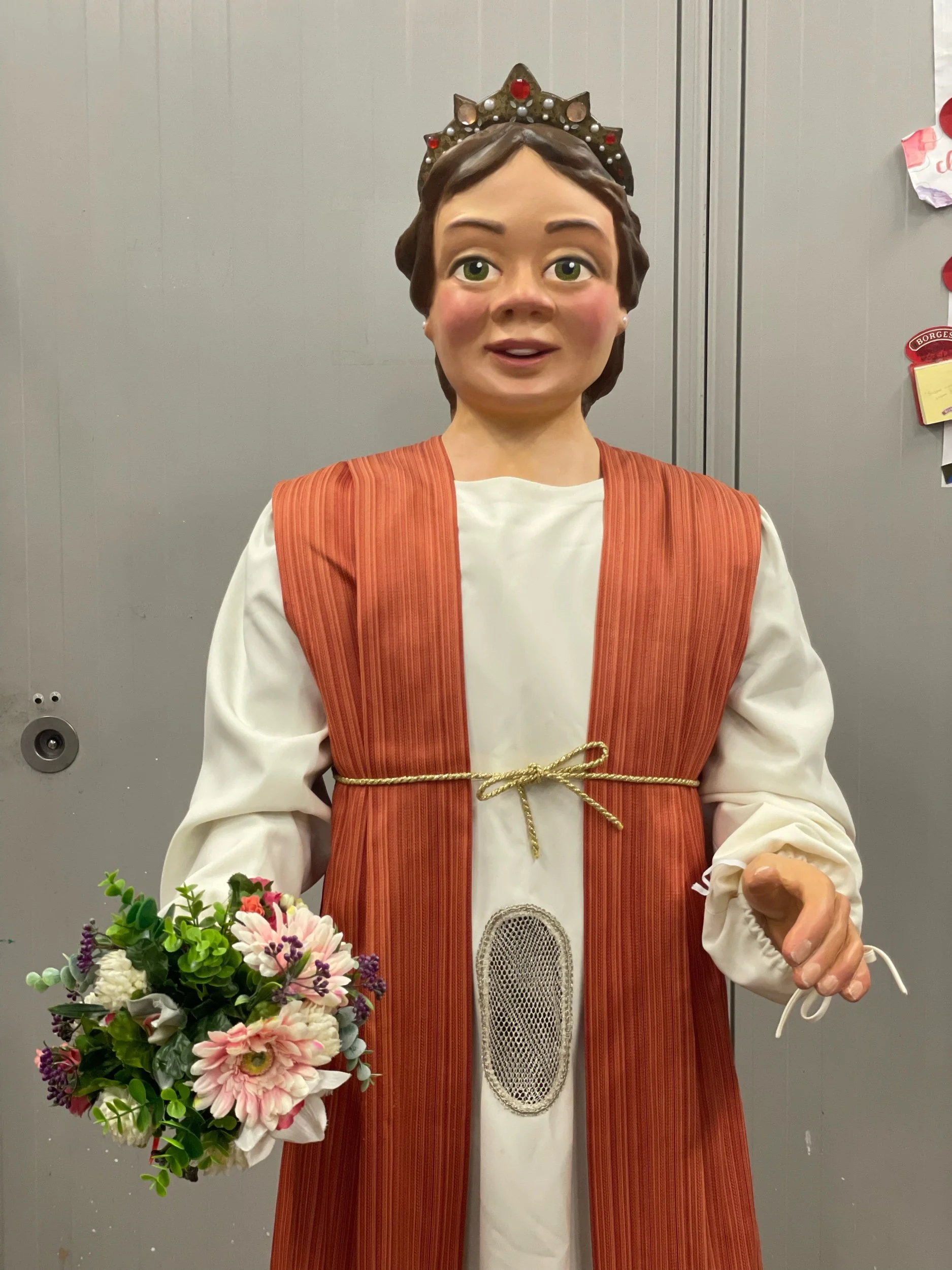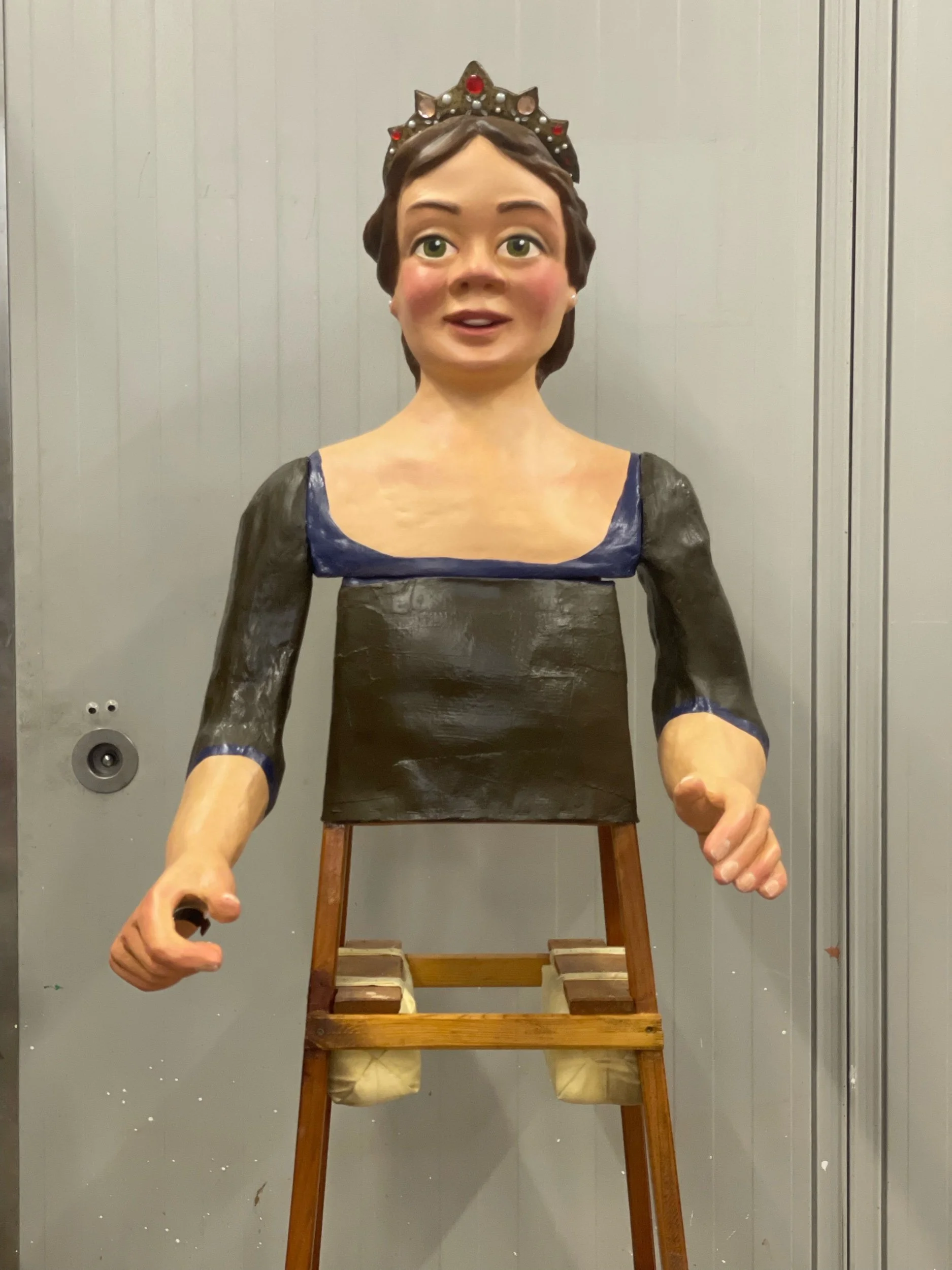 La gegantona Gal·la va venir al taller després d’una desafortunada caiguda. Aprofitant l’ocasió es va optar per anivellar les espatlles, refer part dels braços i fer que el bust fós desmuntable per facilitar-ne el seu trasllat.