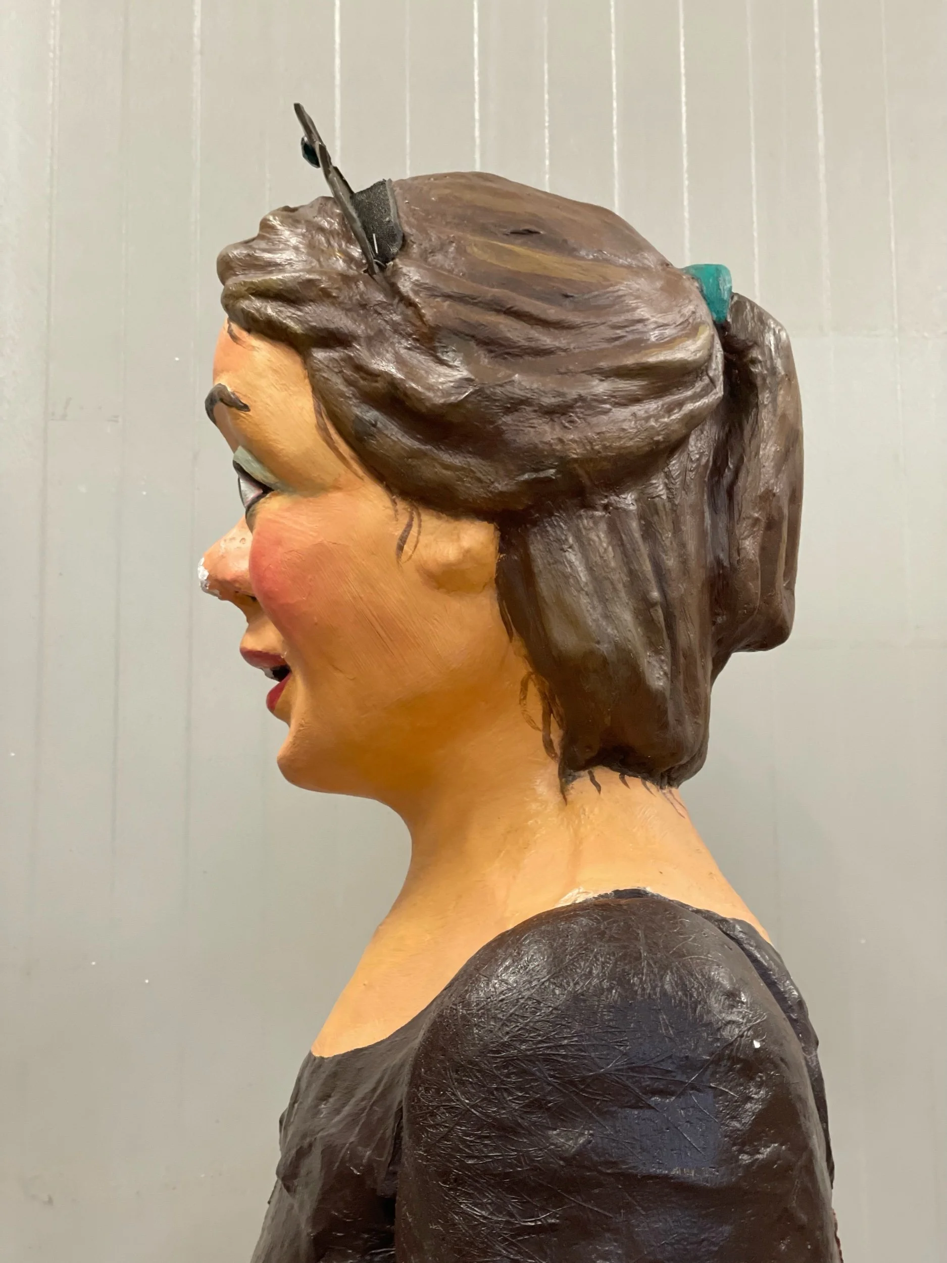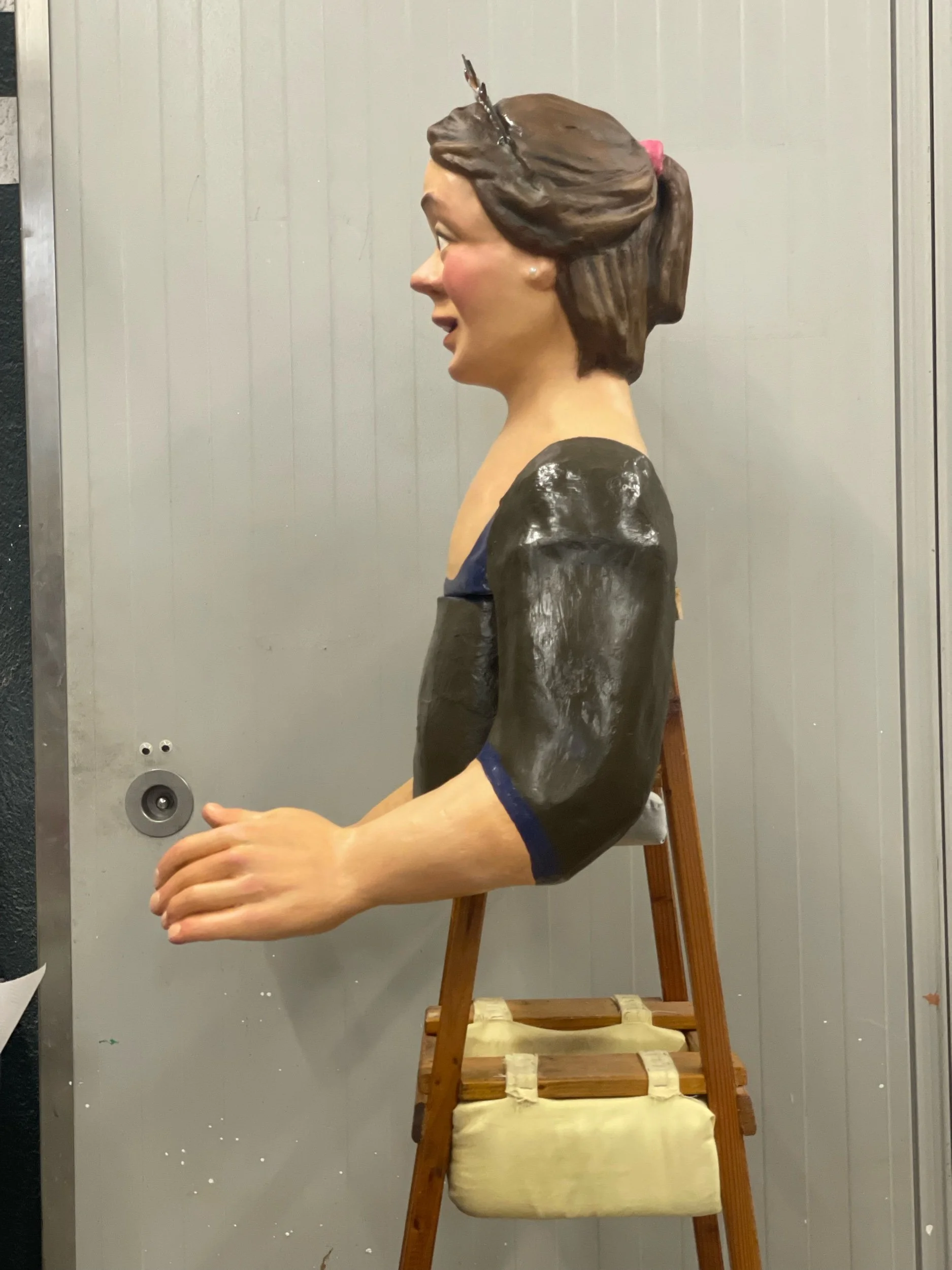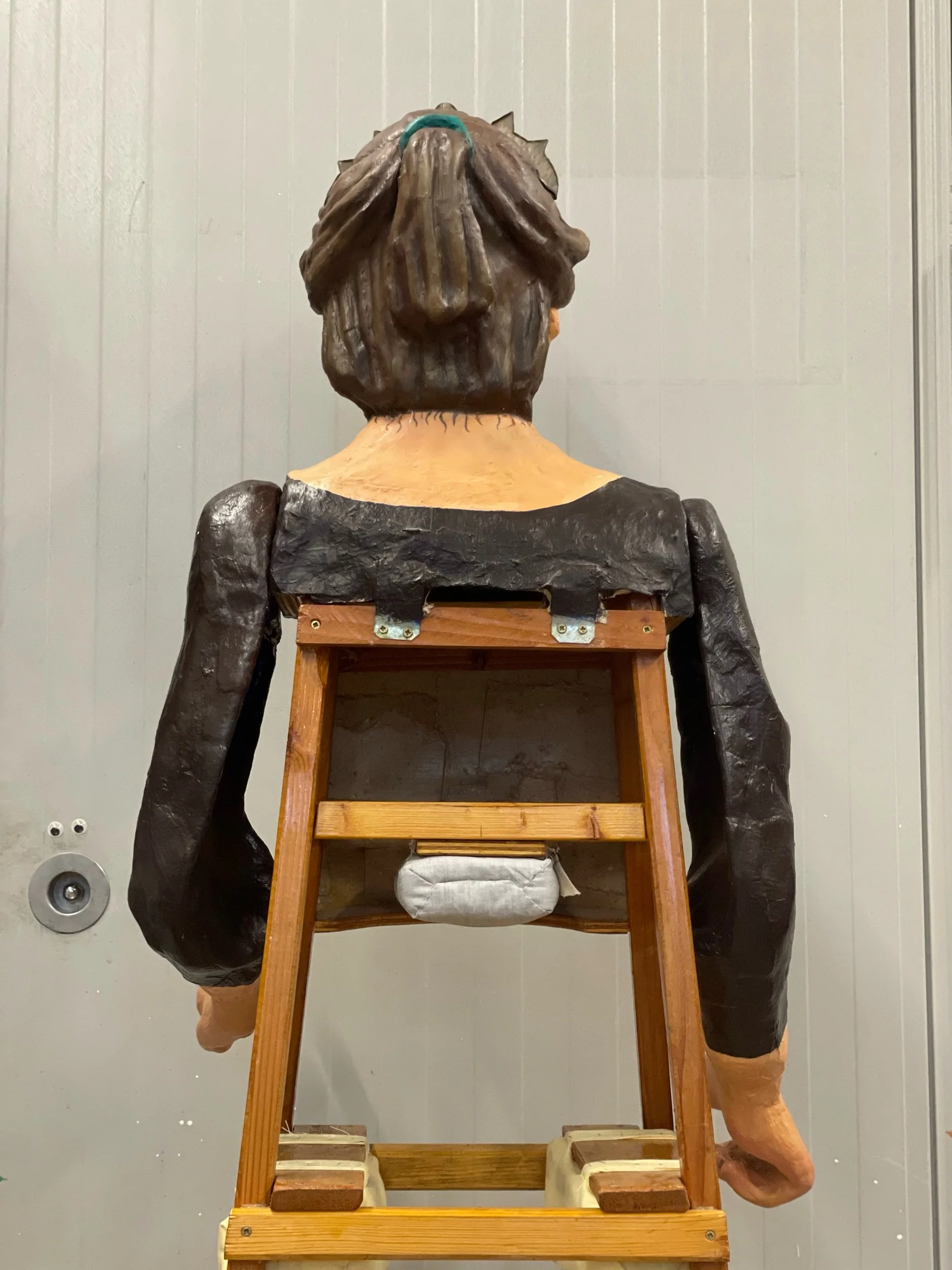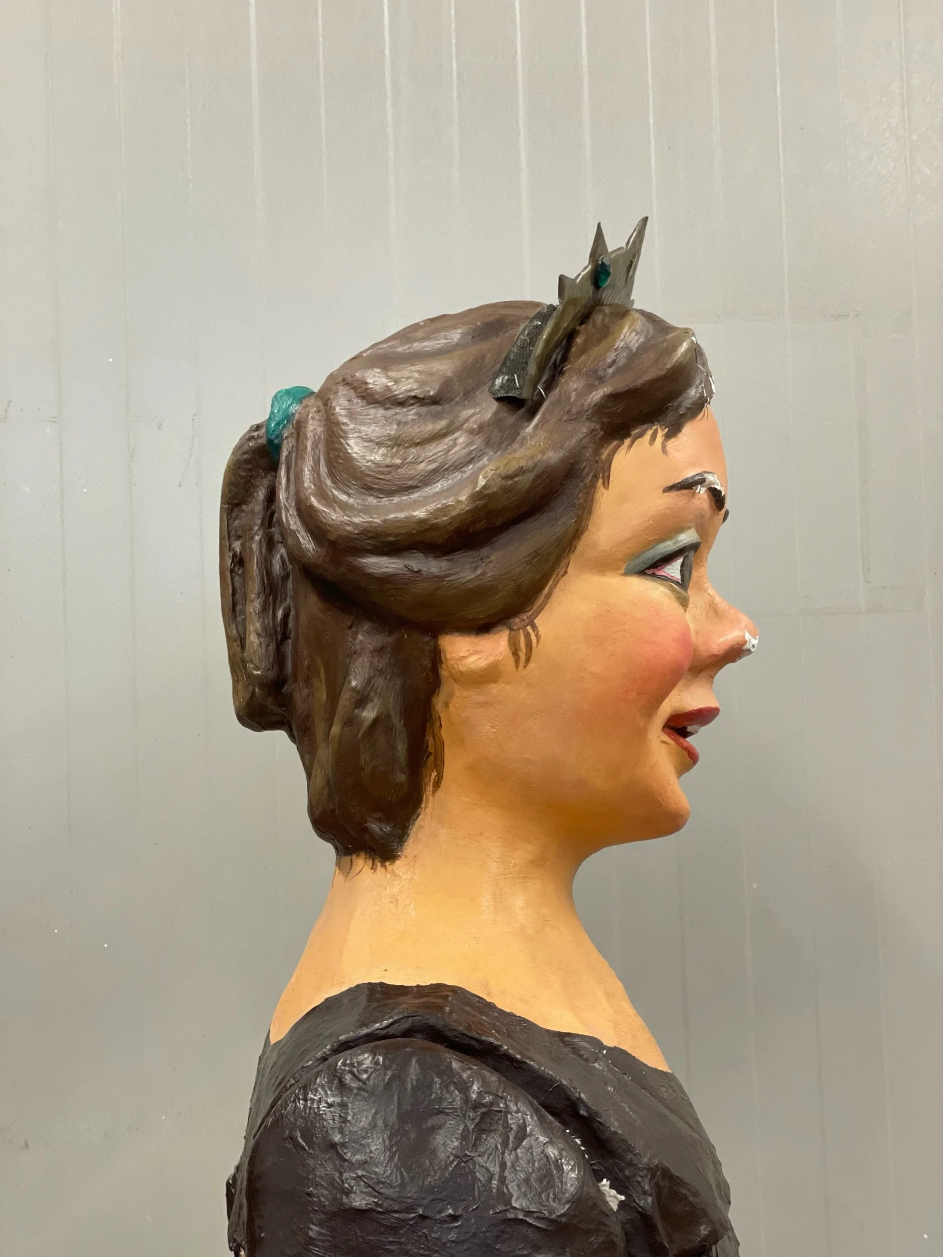La gegantona Gal·la va venir al taller després d’una desafortunada caiguda. Aprofitant l’ocasió es va optar per anivellar les espatlles, refer part dels braços i fer que el bust fós desmuntable per facilitar-ne el seu trasllat.
