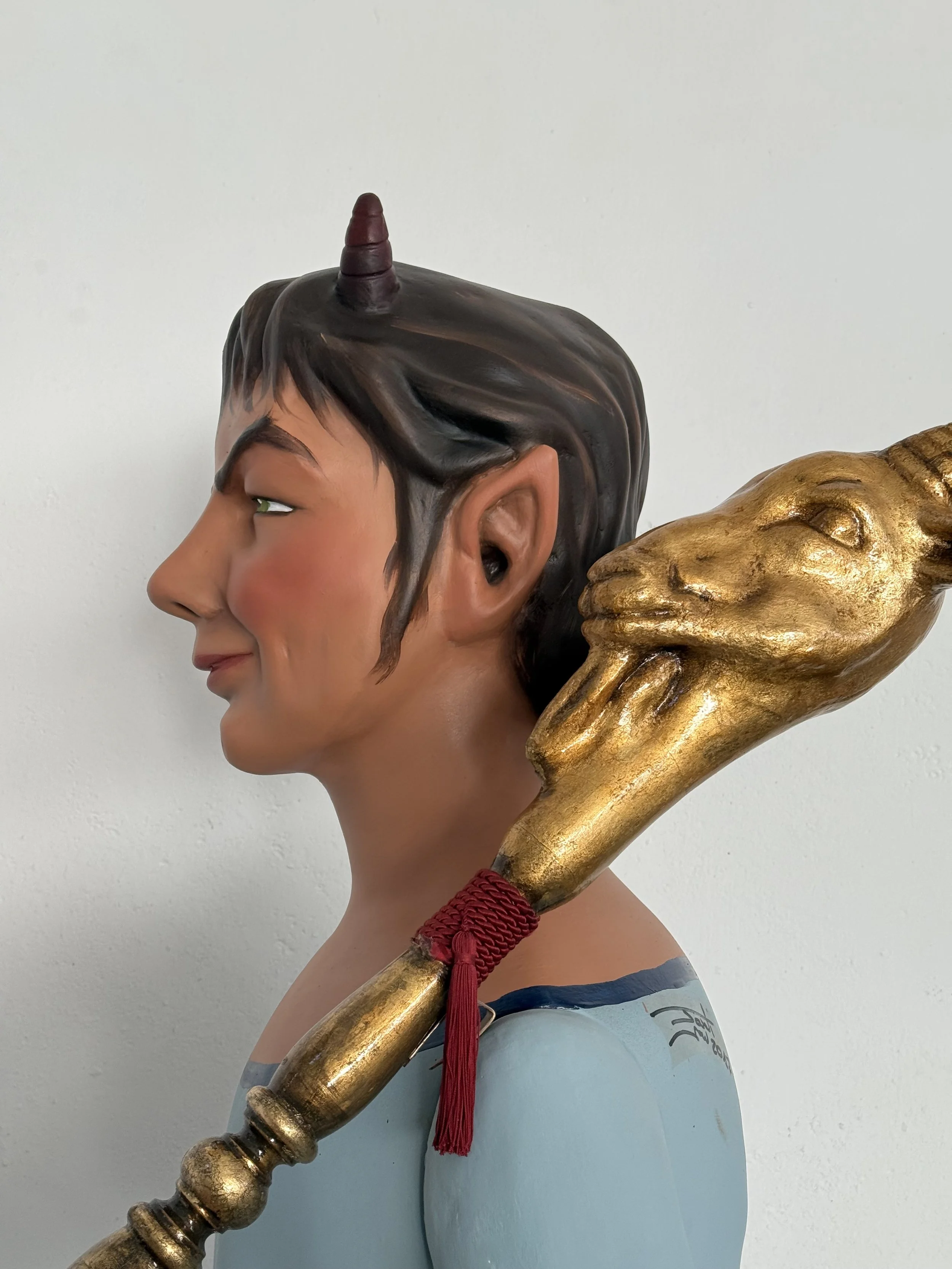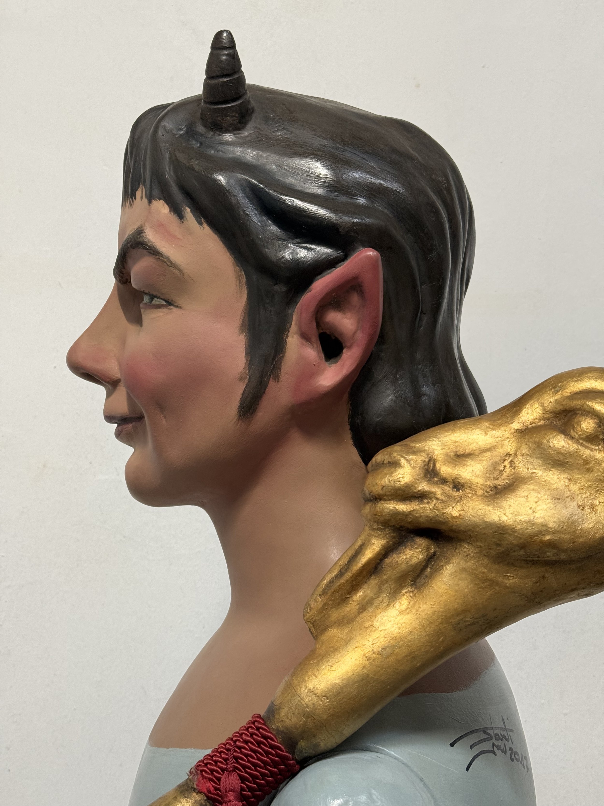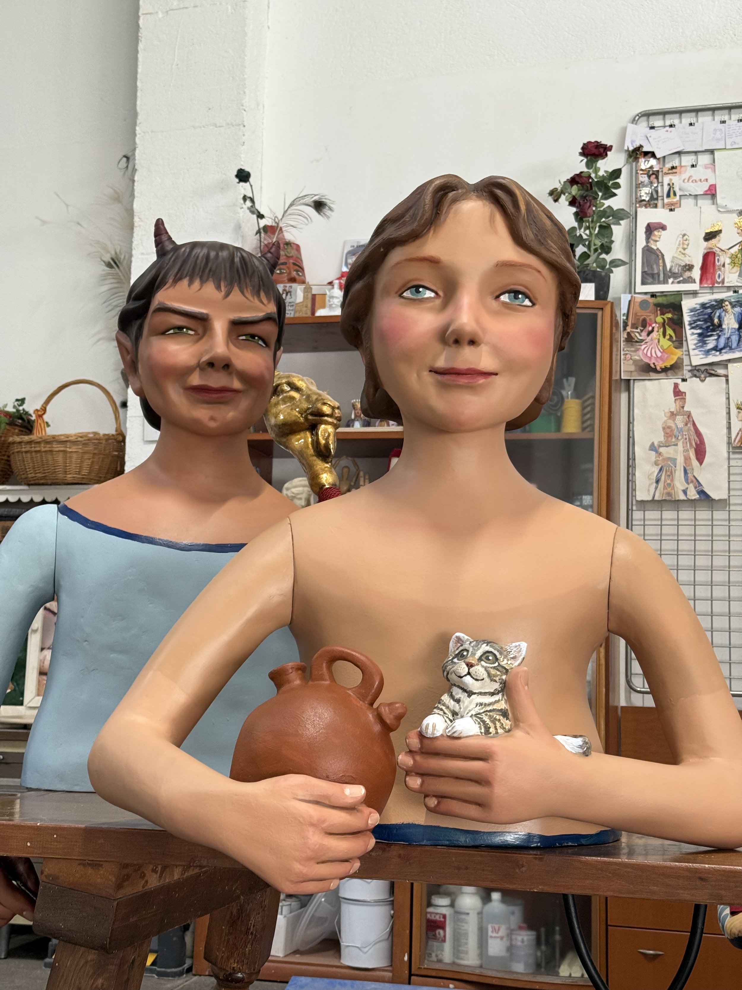 Aquests dies hem treballat amb els gegantons infantils de Martorell, als quals els hi hem reparat algunes parts on el cartró estava debilitat o s’havia trencat. També hem aprofitat per repassar alguns cops i esquerdes que presentaven i finalment els hi hem fet una nova policromia perquè tornéssin a lluïr com nous!
