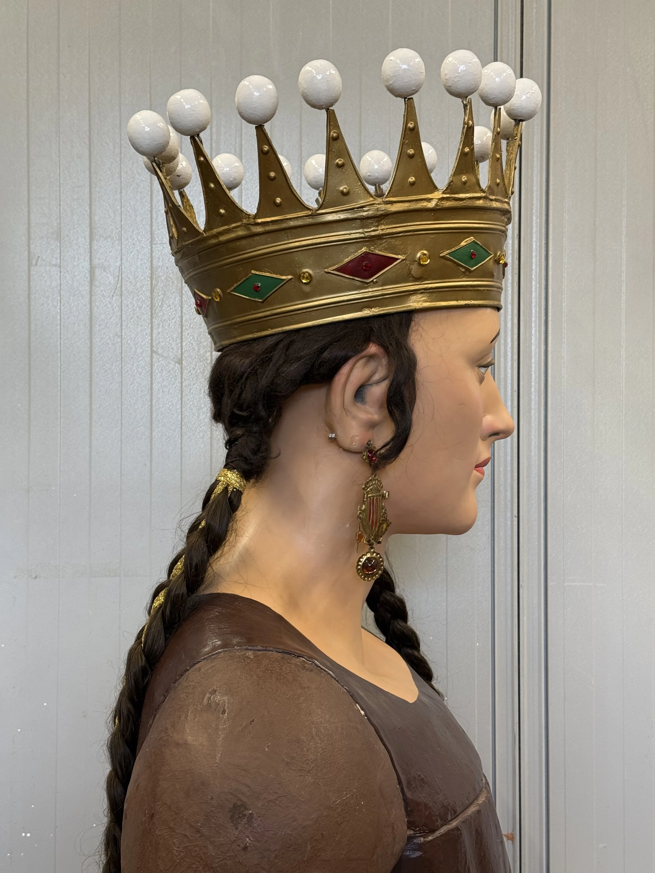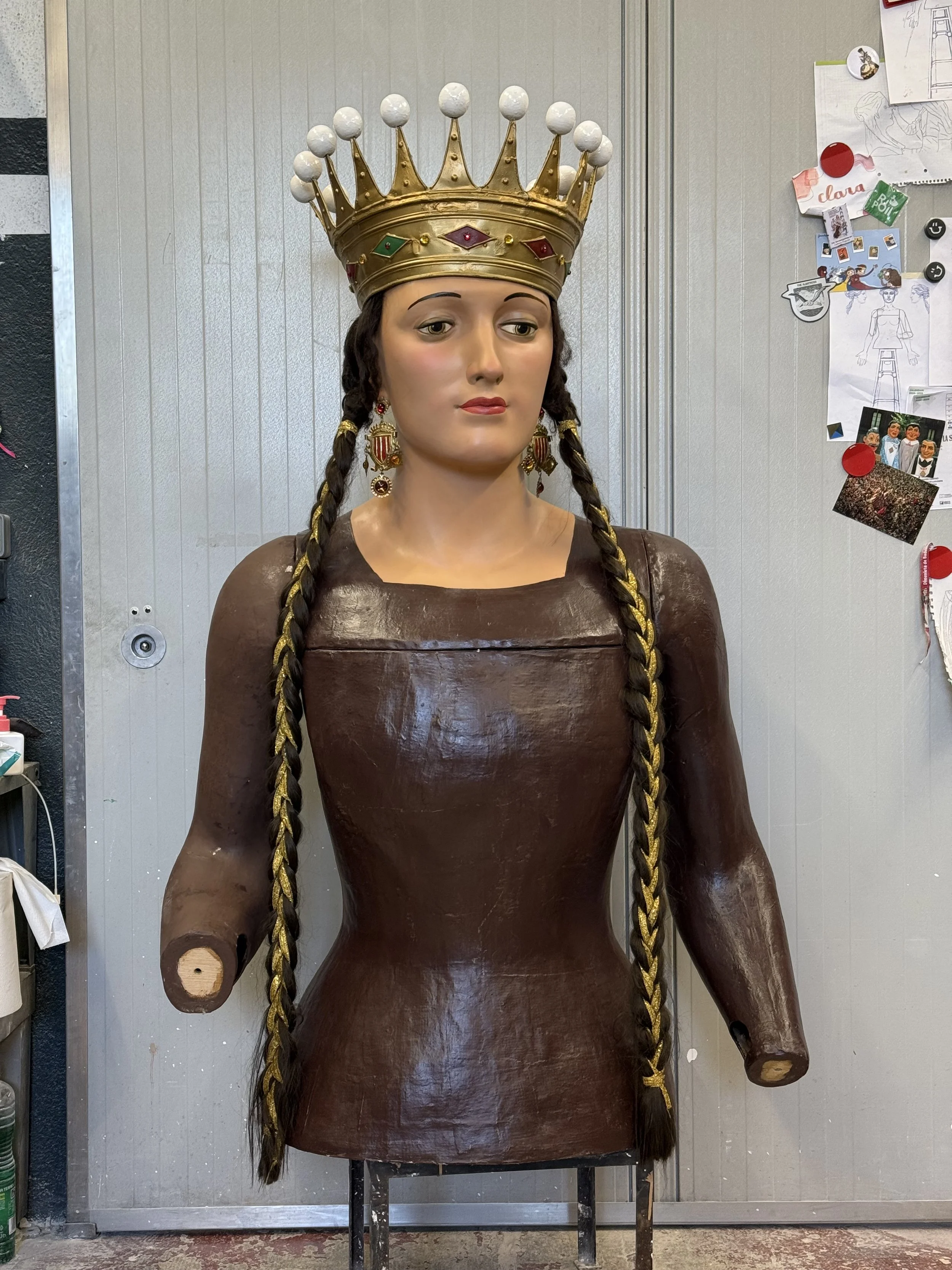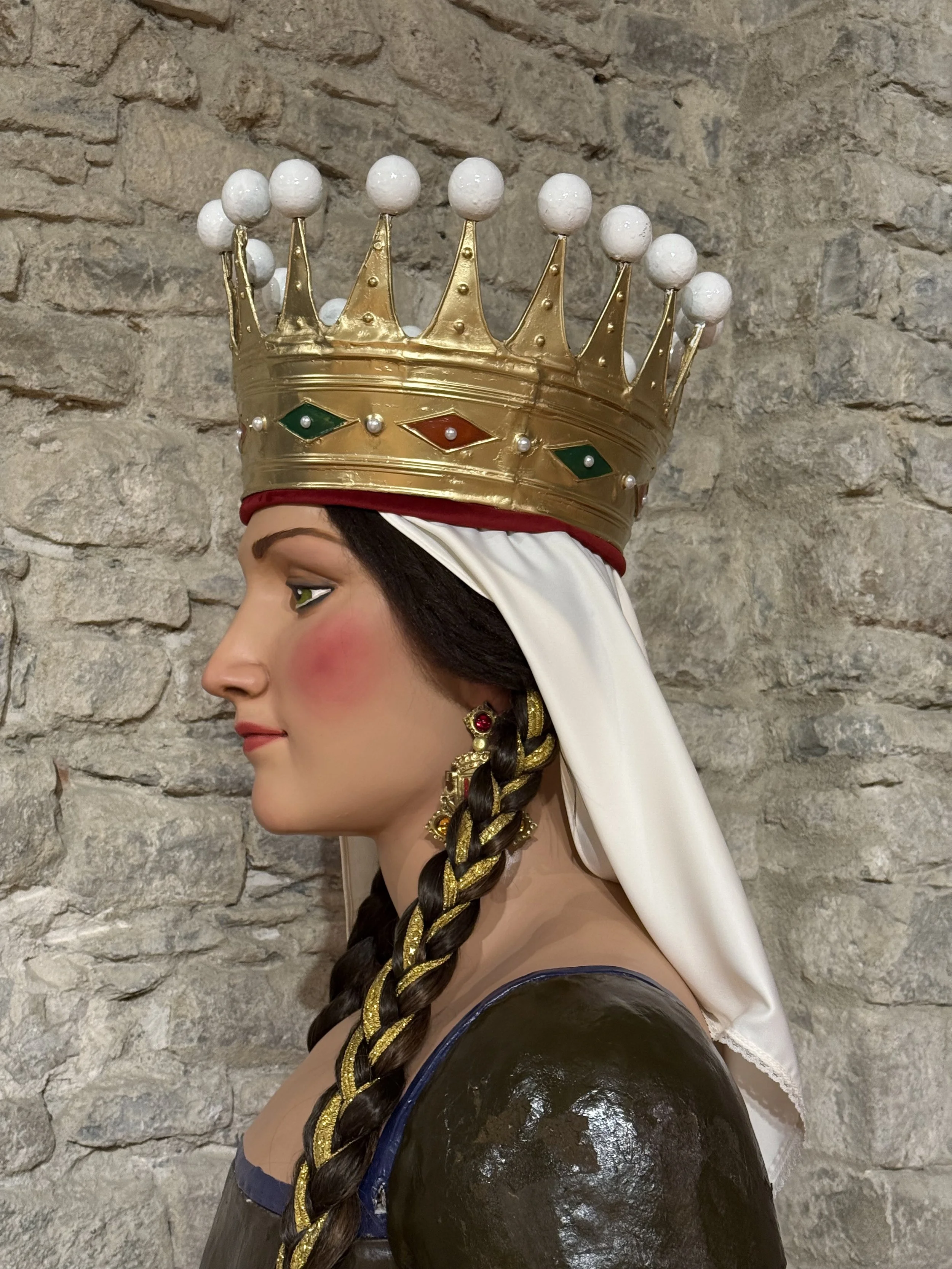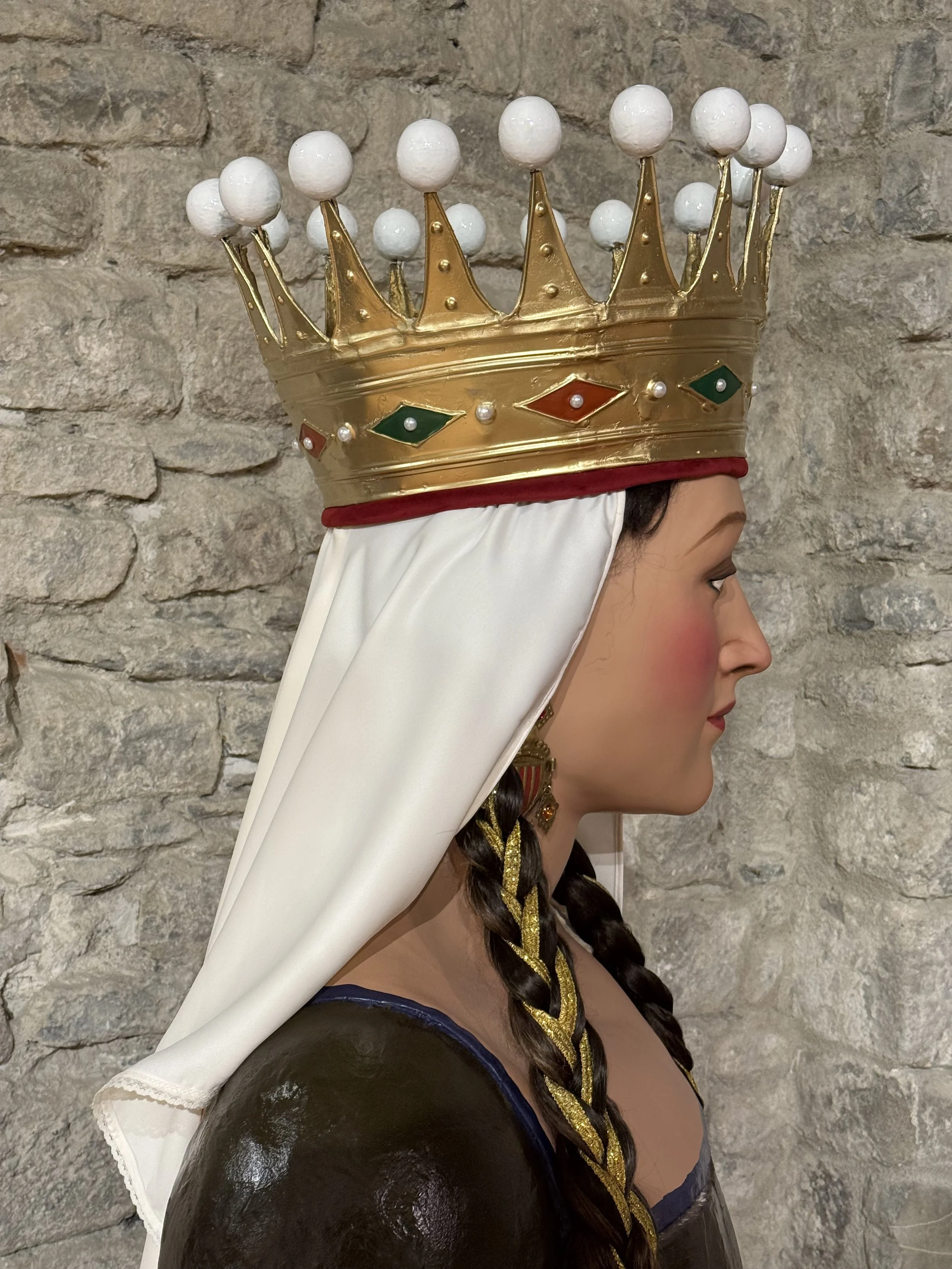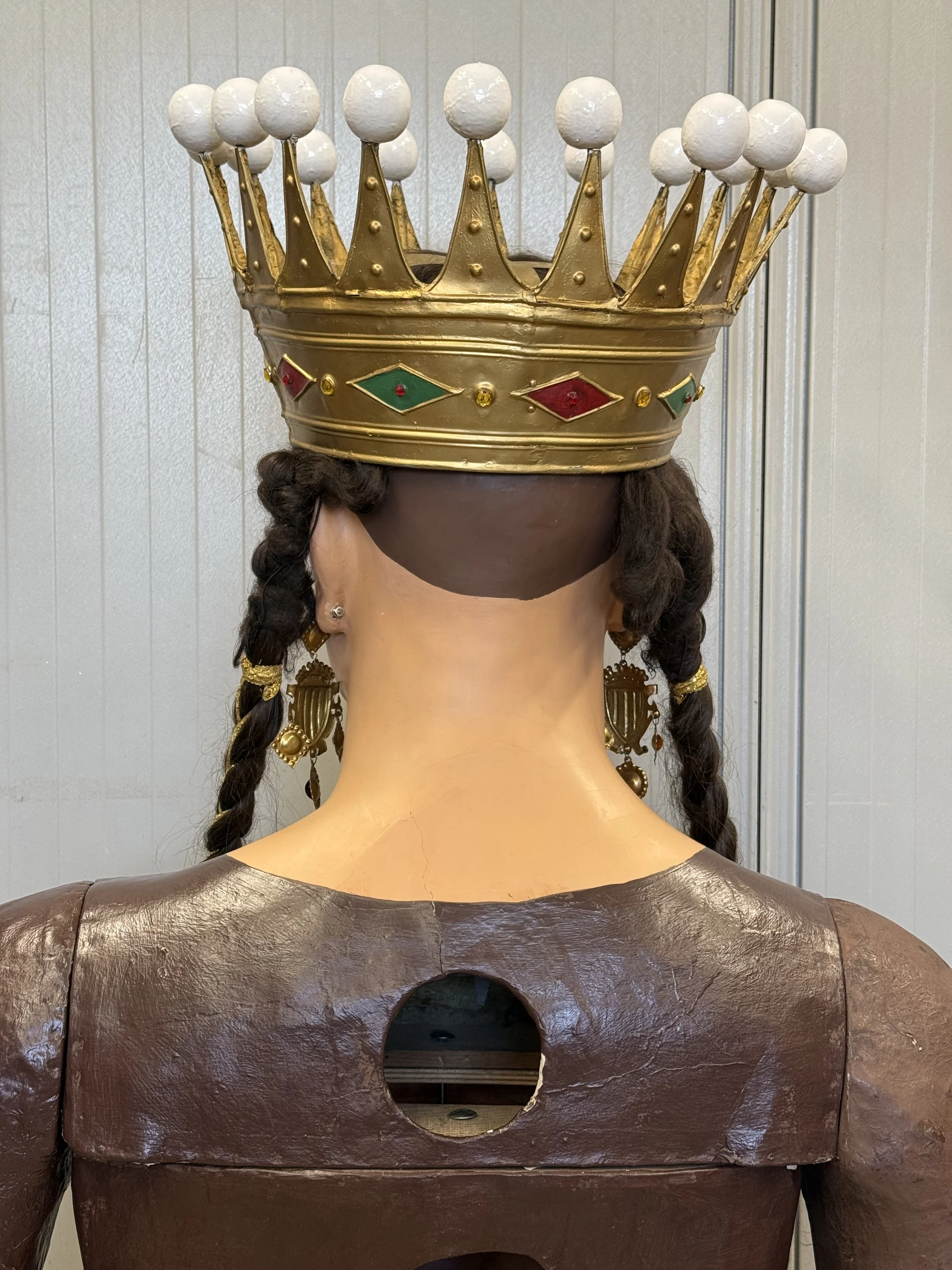 També s’ha fet un repàs de les corones dotant-les de nova policromia i complements de perles i nous velluts. Alhora que s’ha confeccionat un nou vel i un nou collaret de perles per la geganta seguint l’estil del que havia dut en un inici.