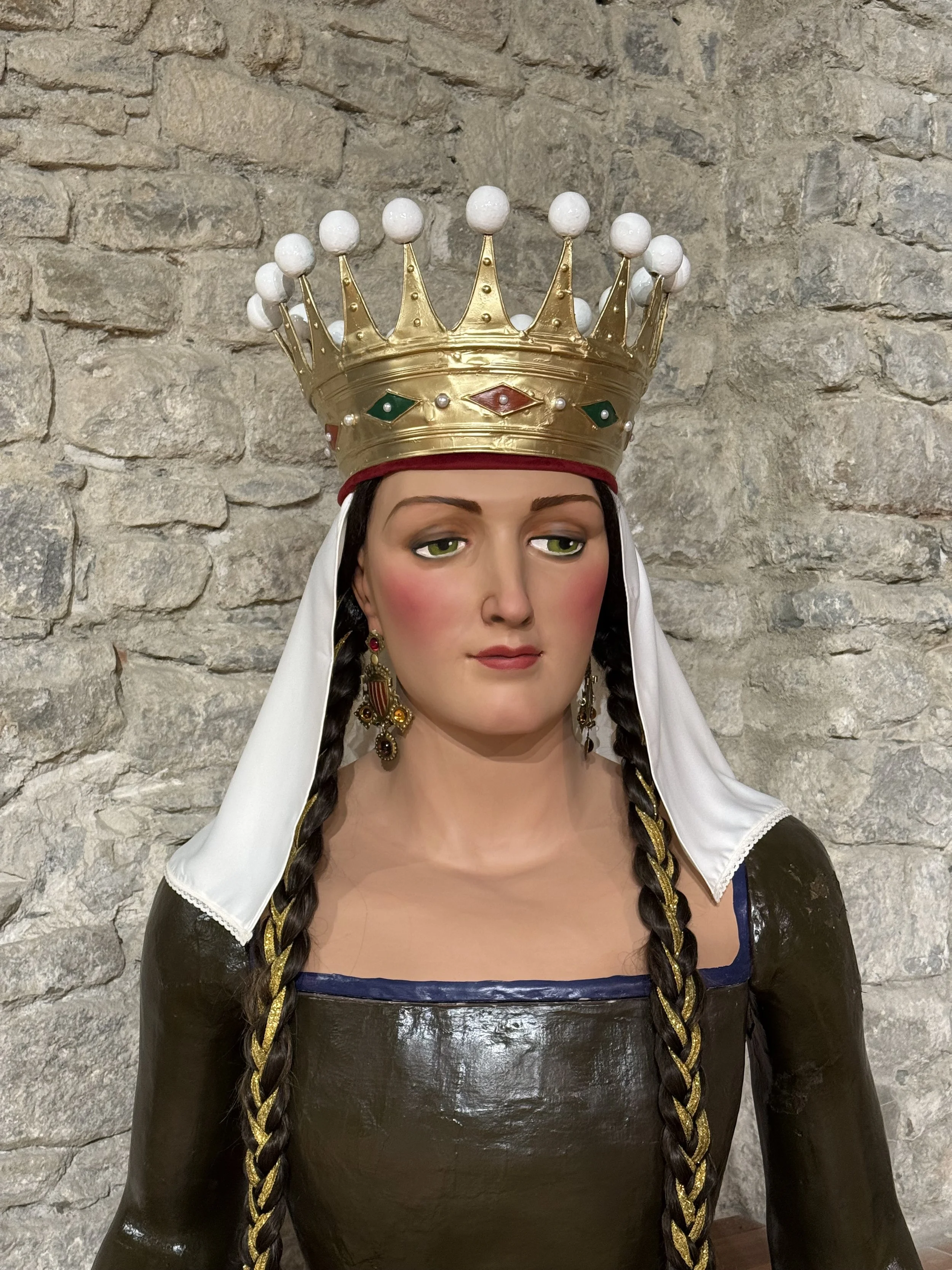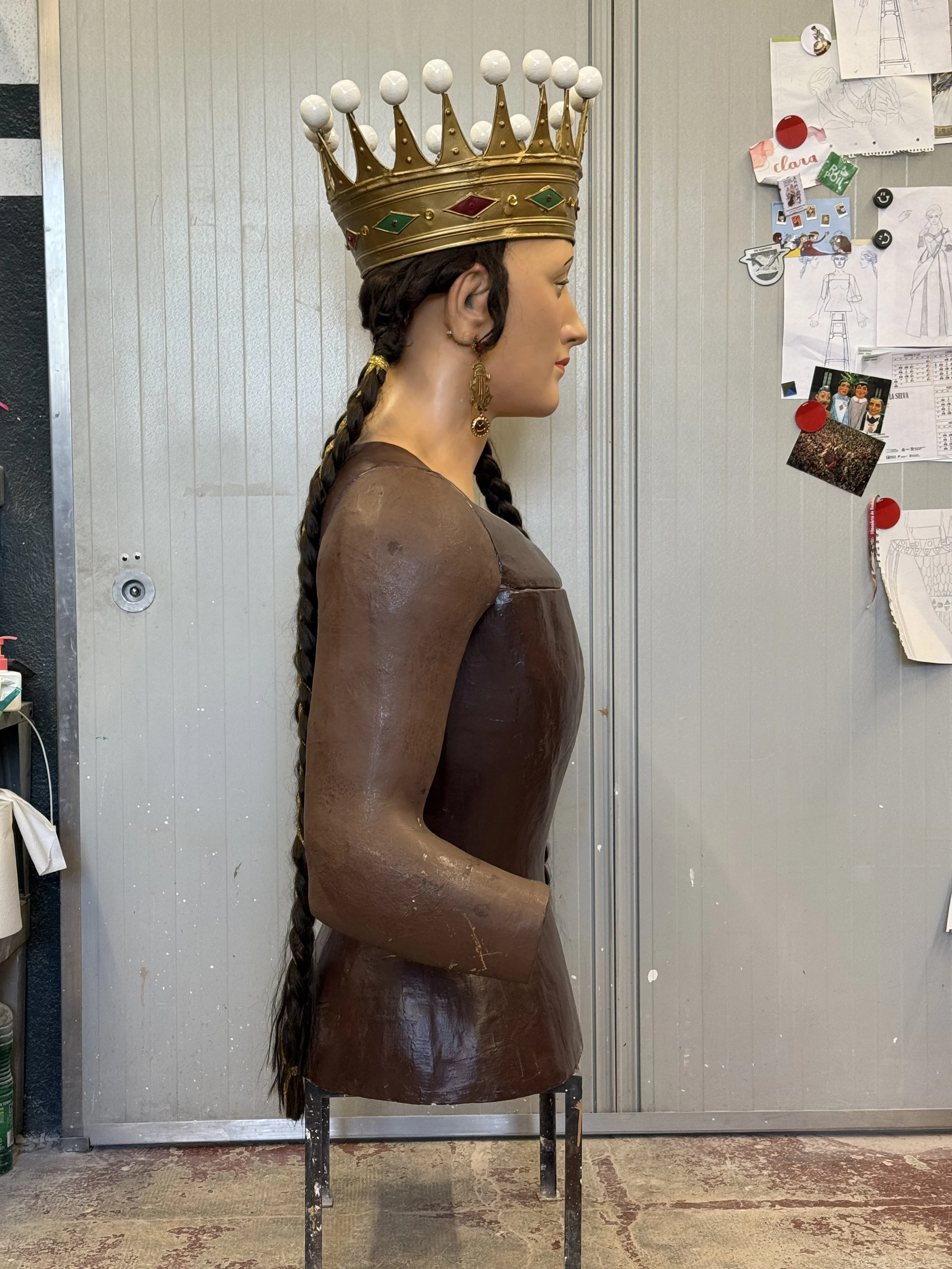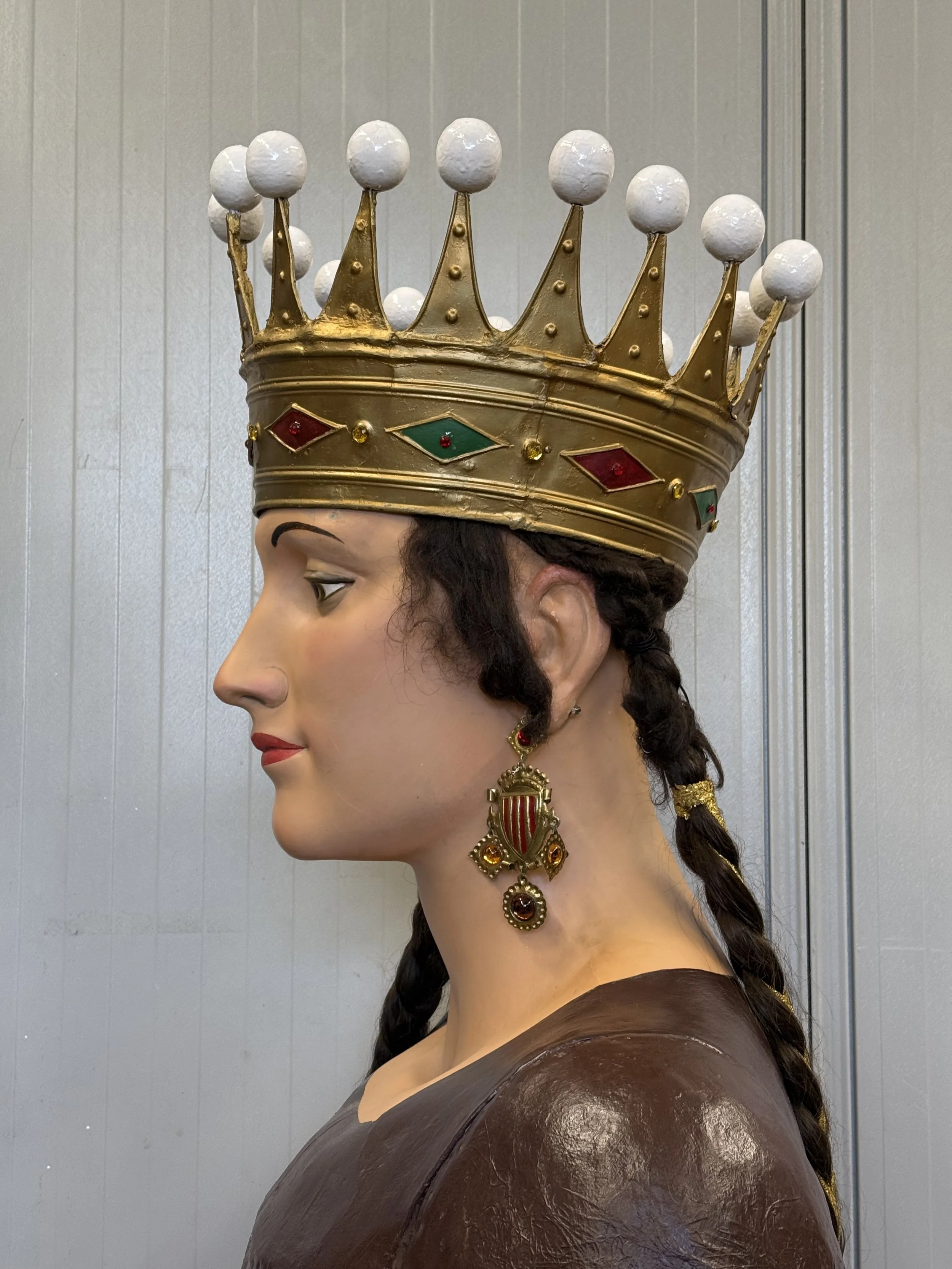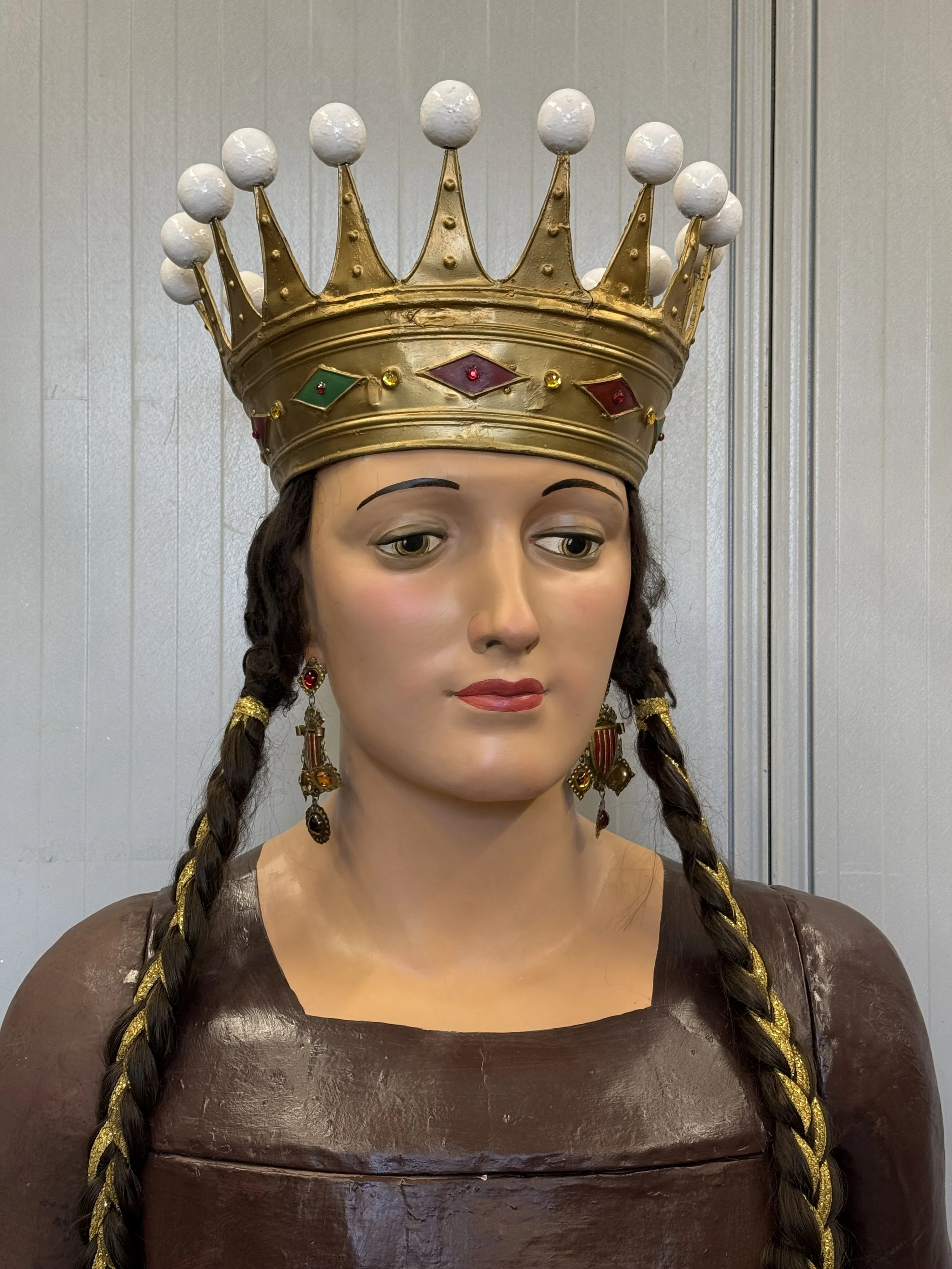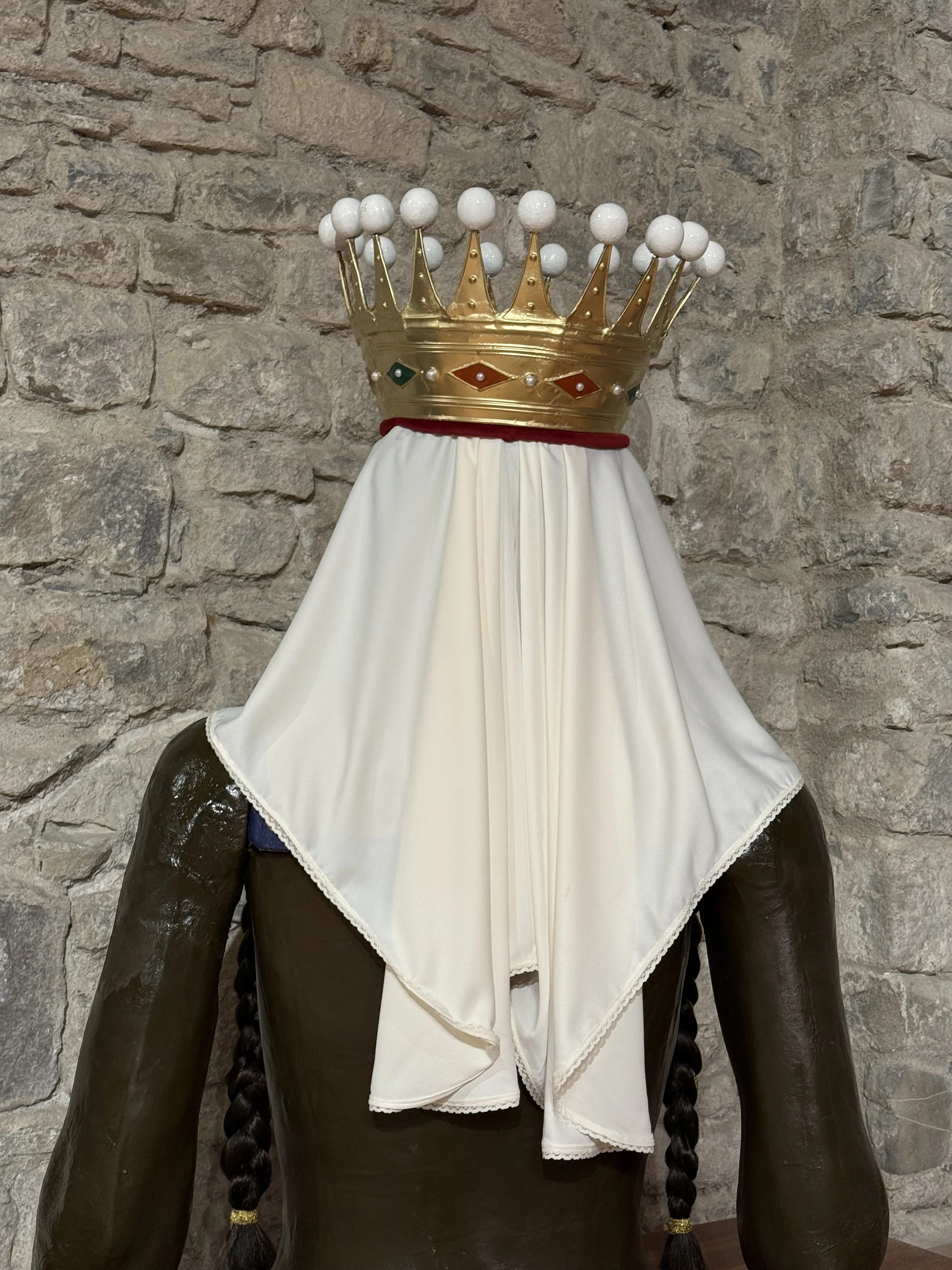 També s’ha fet un repàs de les corones dotant-les de nova policromia i complements de perles i nous velluts. Alhora que s’ha confeccionat un nou vel i un nou collaret de perles per la geganta seguint l’estil del que havia dut en un inici.