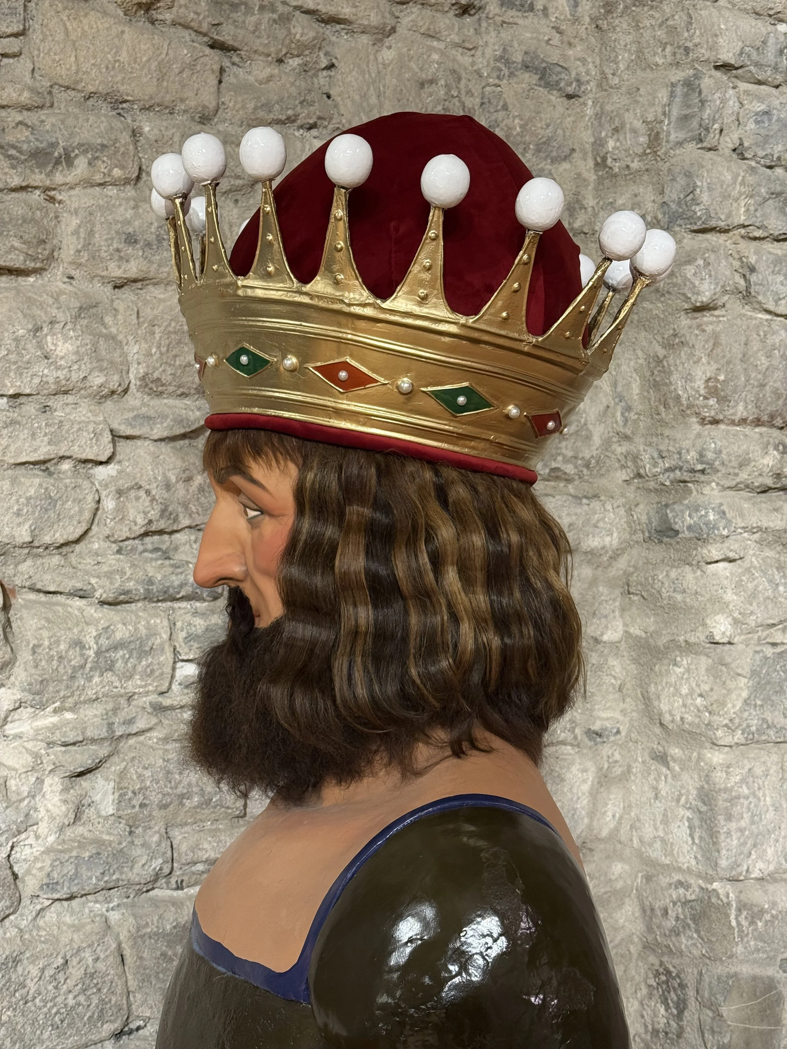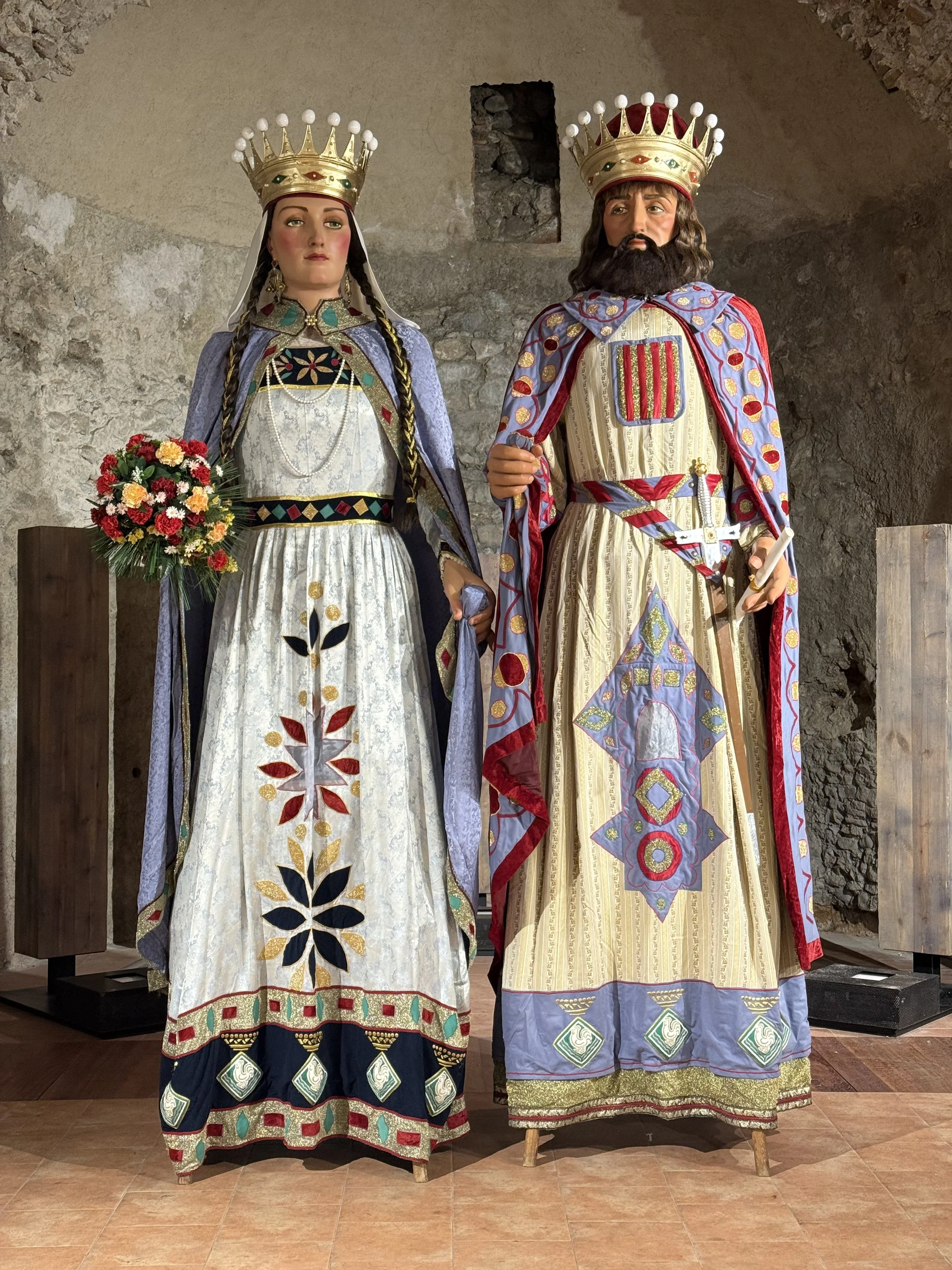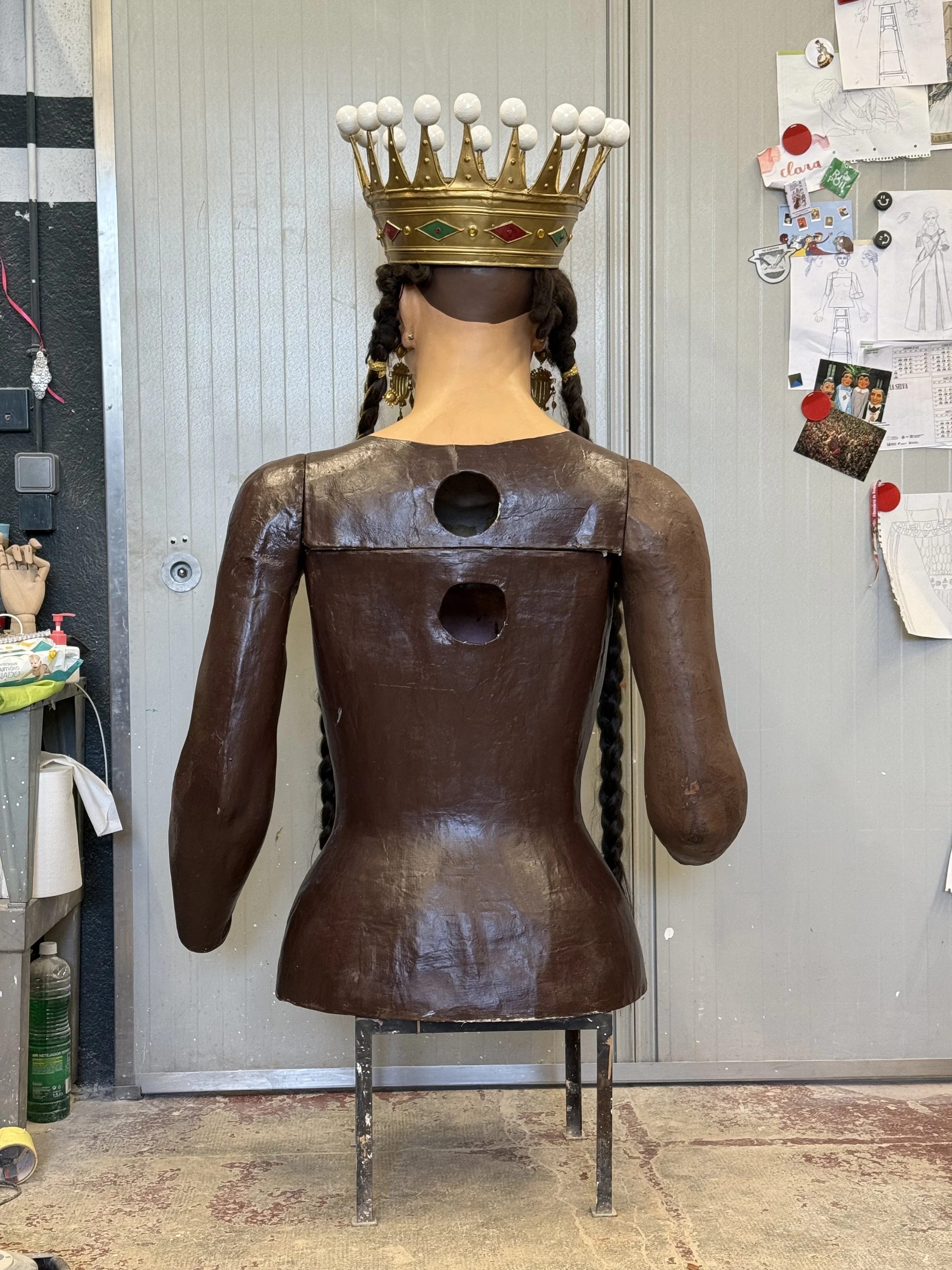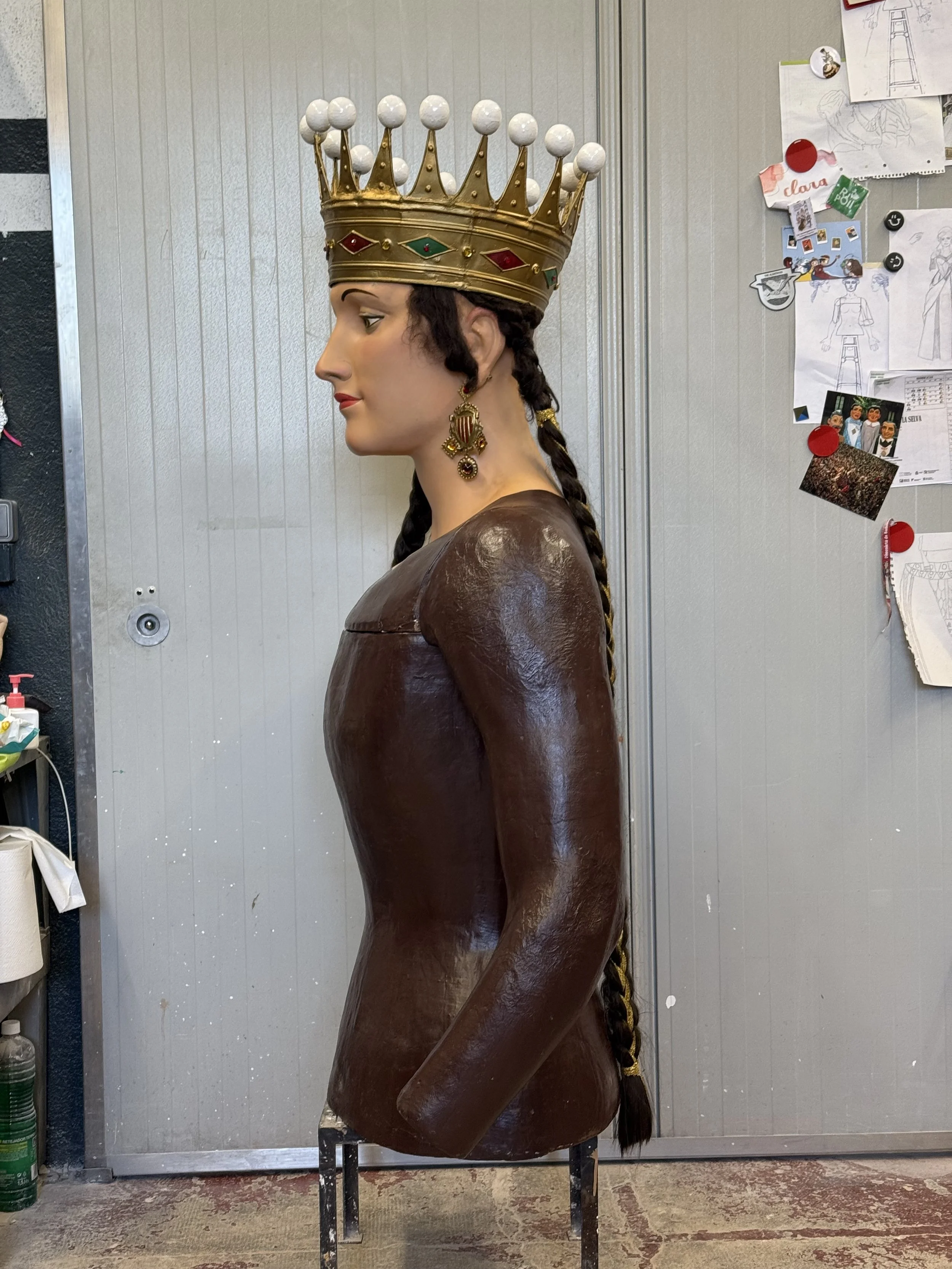 També s’ha fet un repàs de les corones dotant-les de nova policromia i complements de perles i nous velluts. Alhora que s’ha confeccionat un nou vel i un nou collaret de perles per la geganta seguint l’estil del que havia dut en un inici.