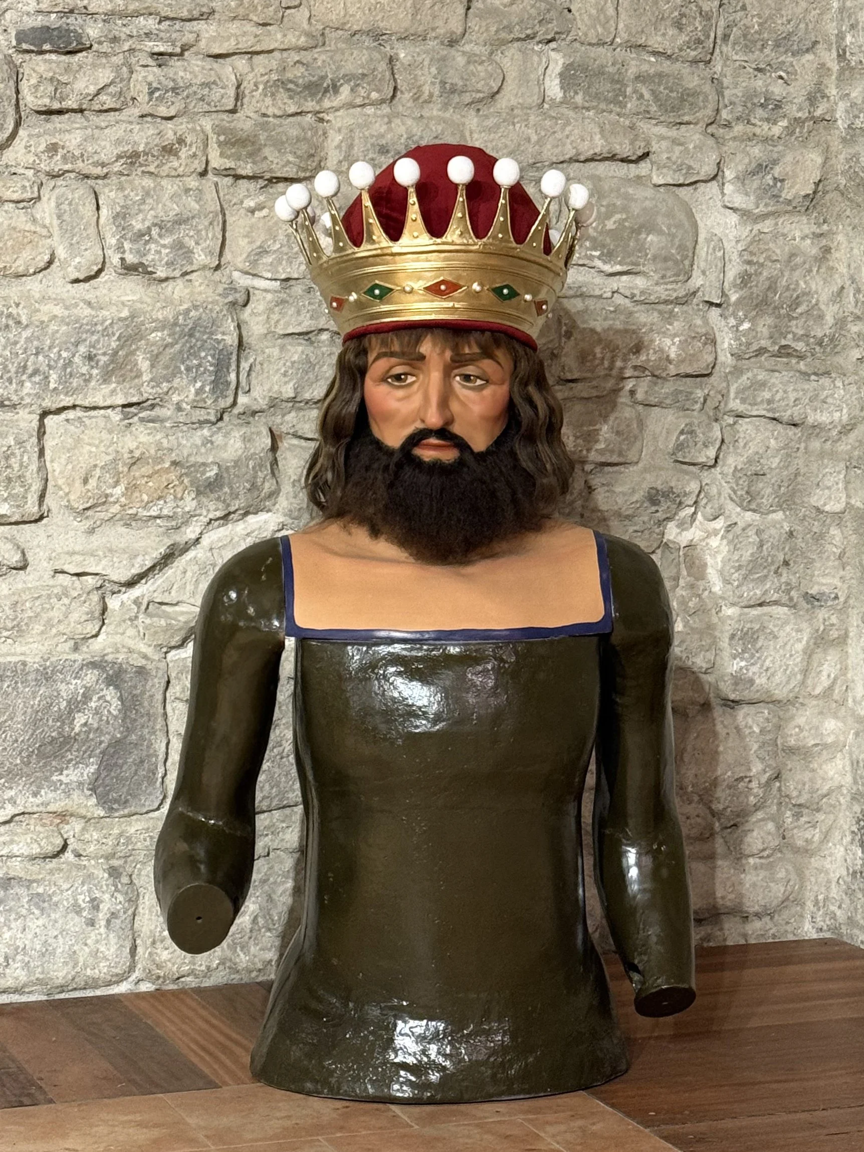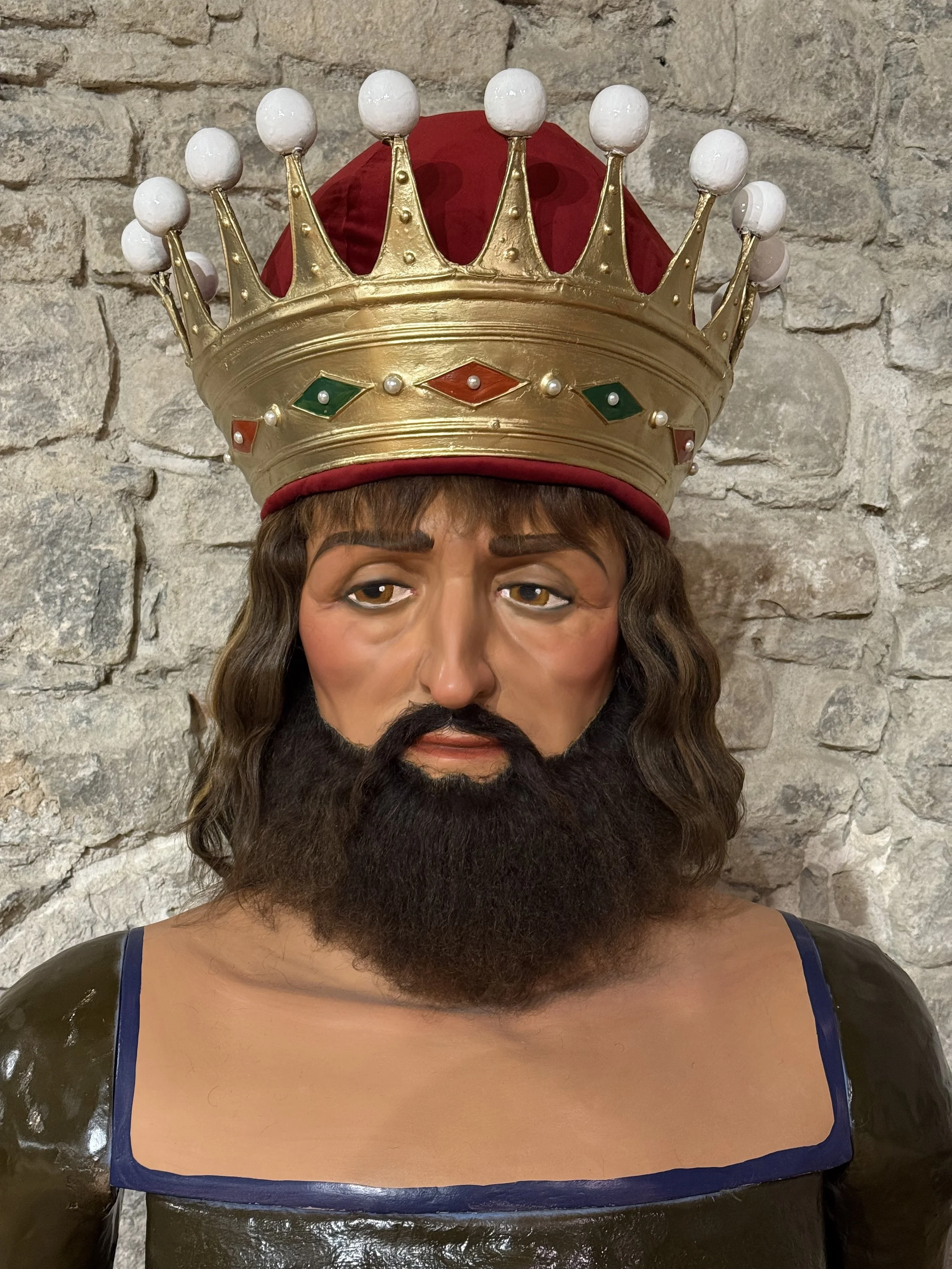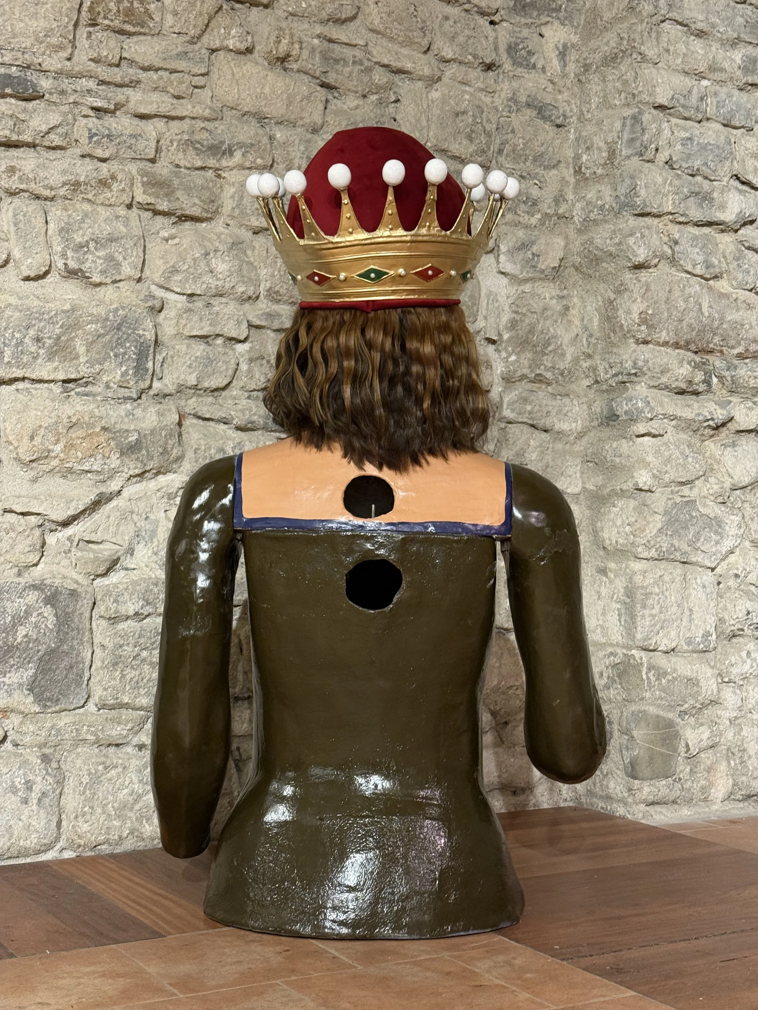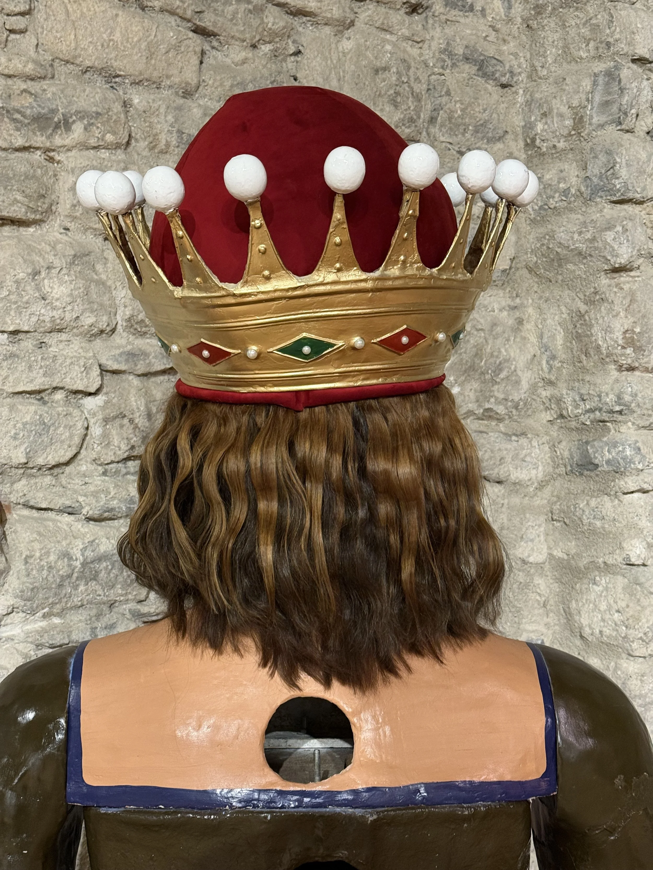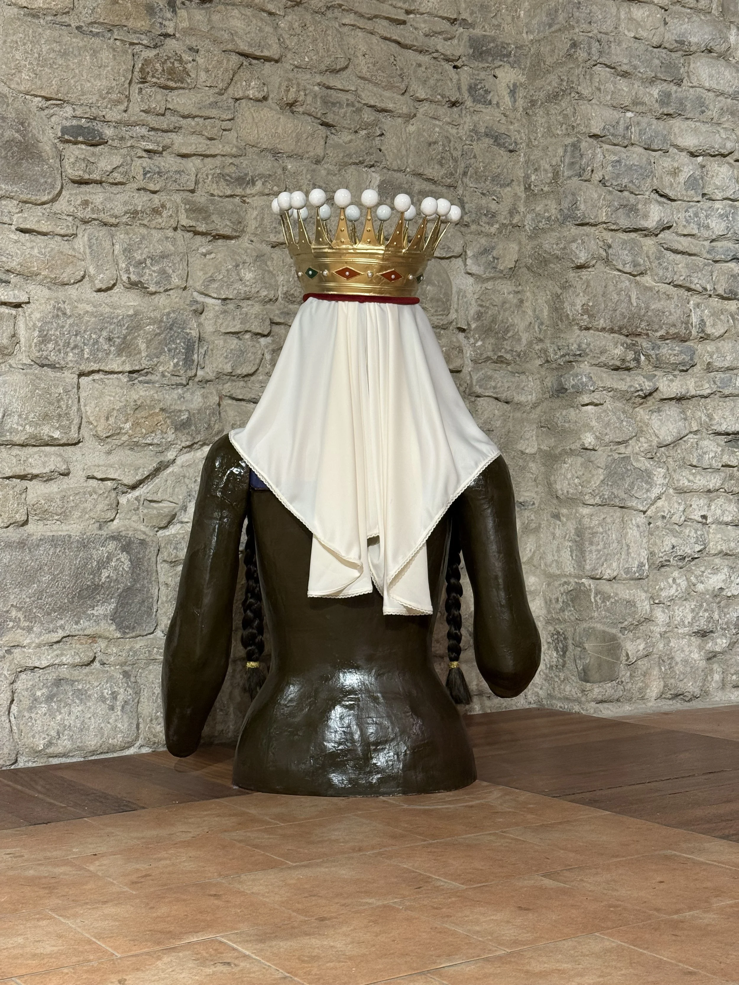 També s’ha fet un repàs de les corones dotant-les de nova policromia i complements de perles i nous velluts. Alhora que s’ha confeccionat un nou vel i un nou collaret de perles per la geganta seguint l’estil del que havia dut en un inici.