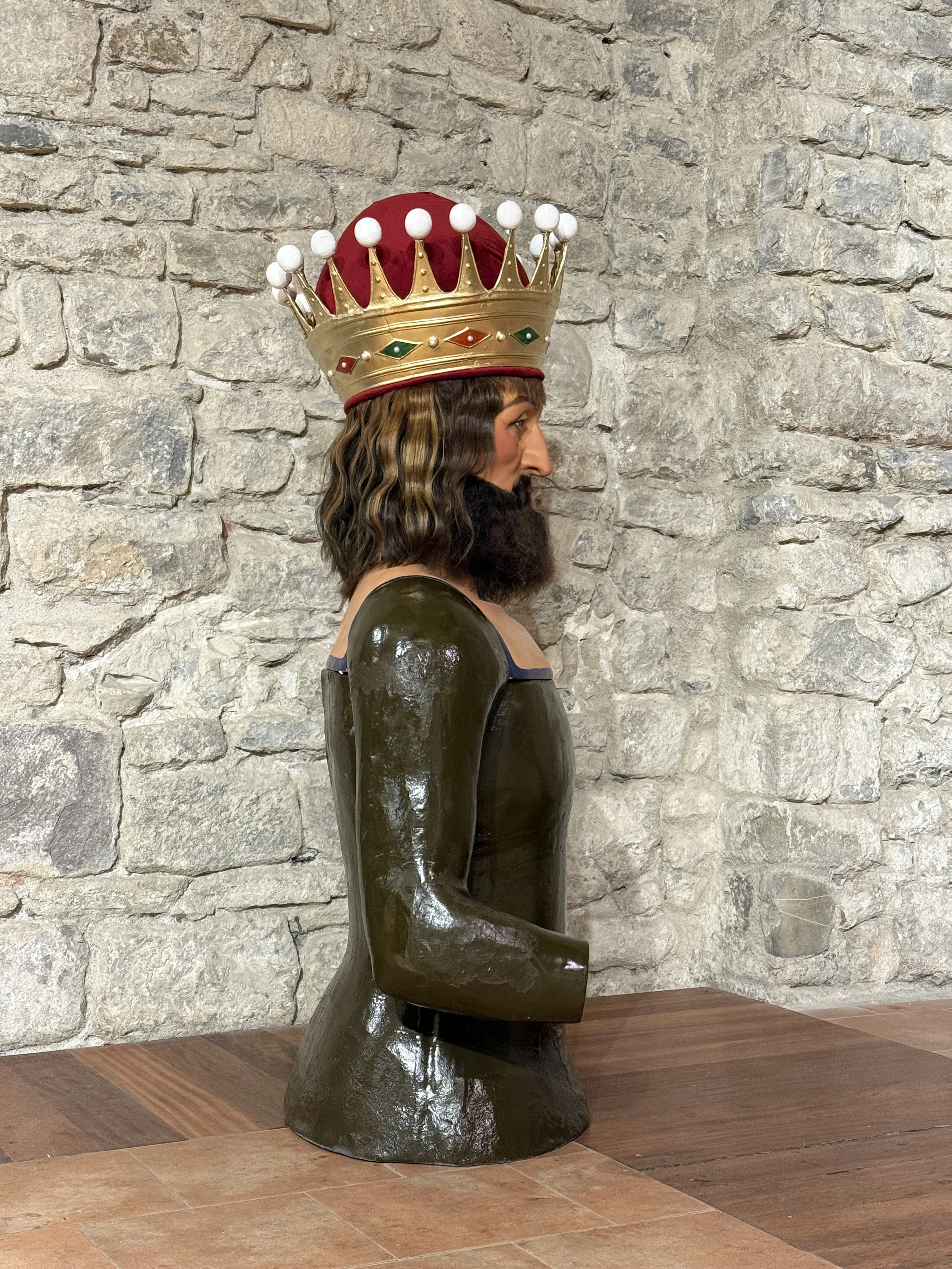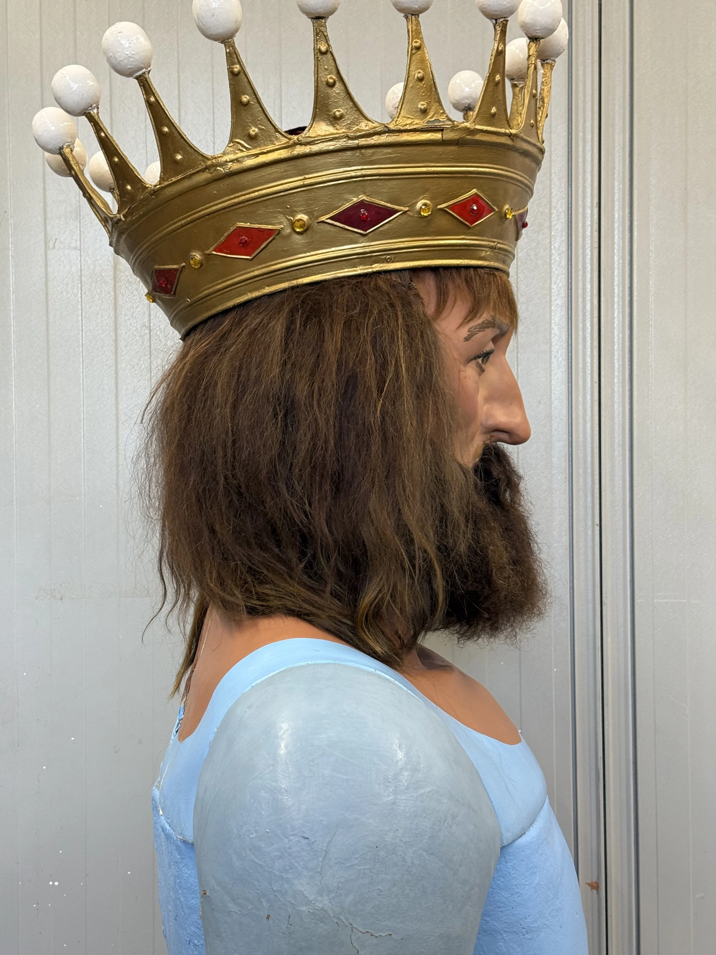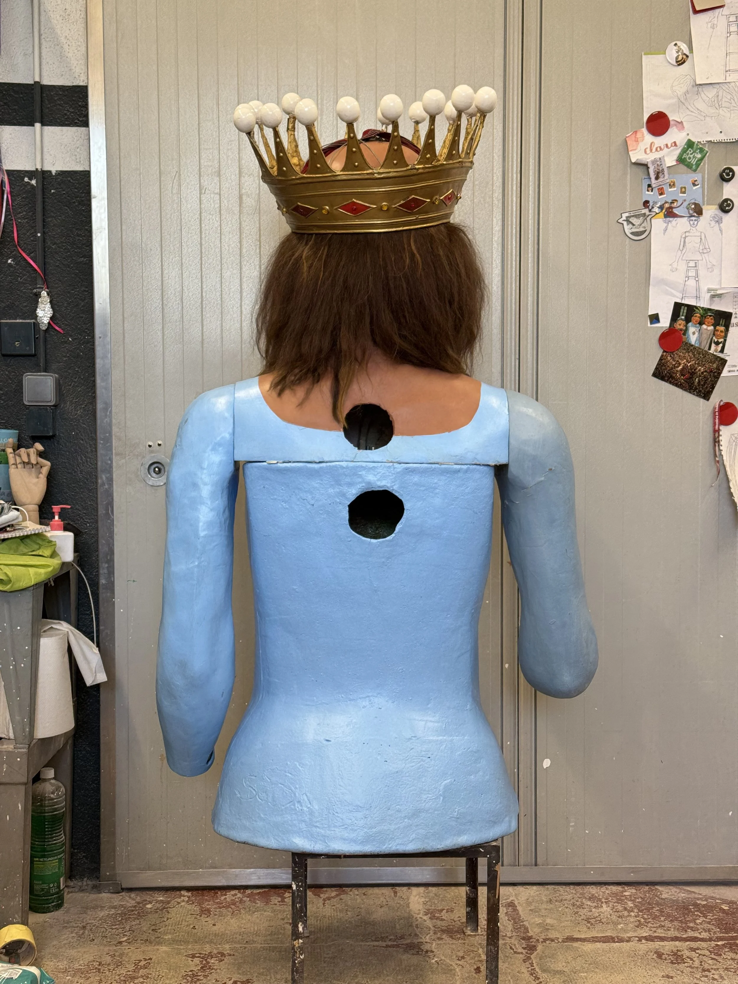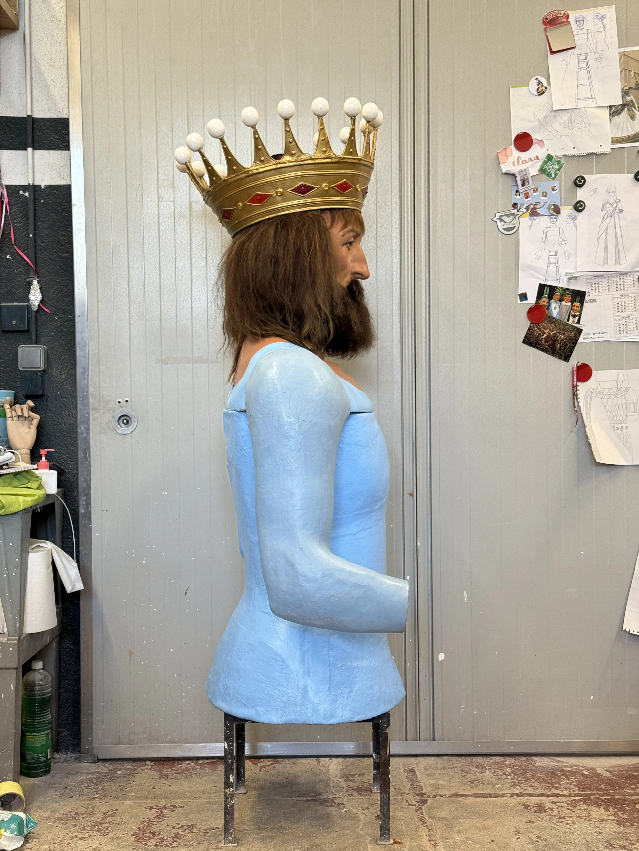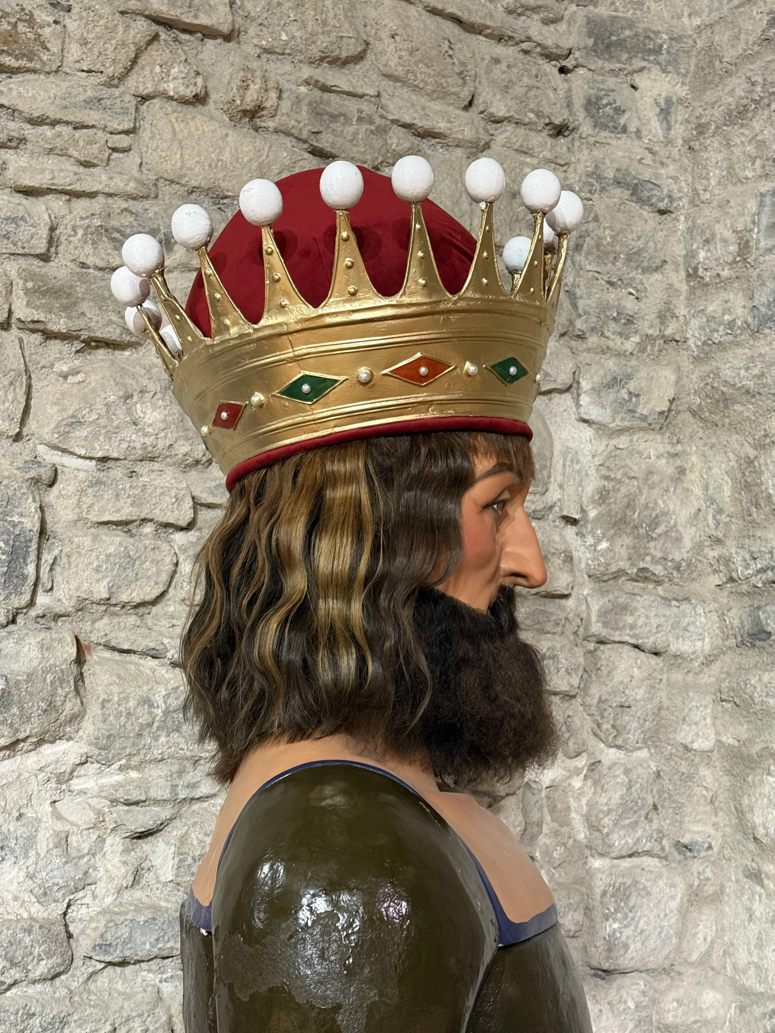 També s’ha fet un repàs de les corones dotant-les de nova policromia i complements de perles i nous velluts. Alhora que s’ha confeccionat un nou vel i un nou collaret de perles per la geganta seguint l’estil del que havia dut en un inici.